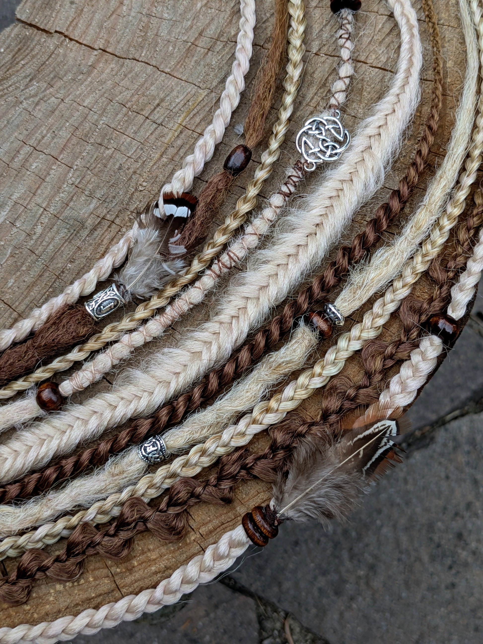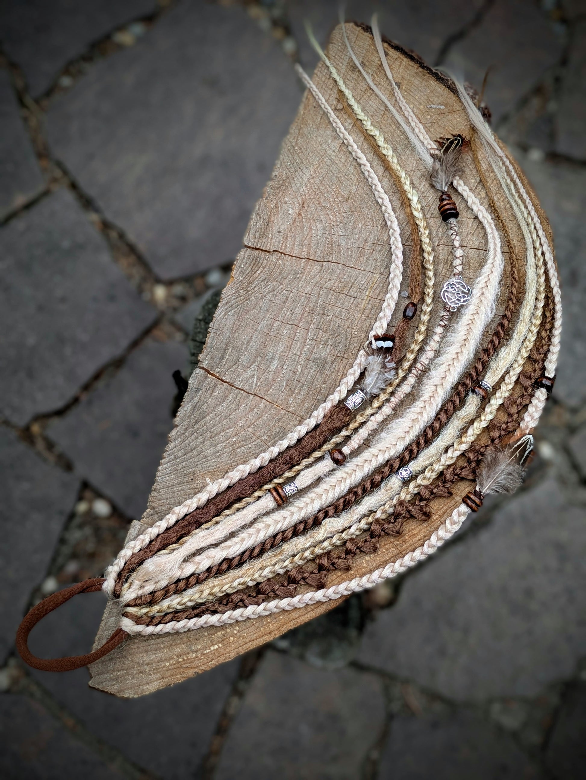 Hnědá gumička s dohromady 7 copánky různých struktur a 3 dready v kombinaci hnědé a odstínů blond. Zdobeno dřevěnými a kovovými korálky, bavlnkou a pírky.