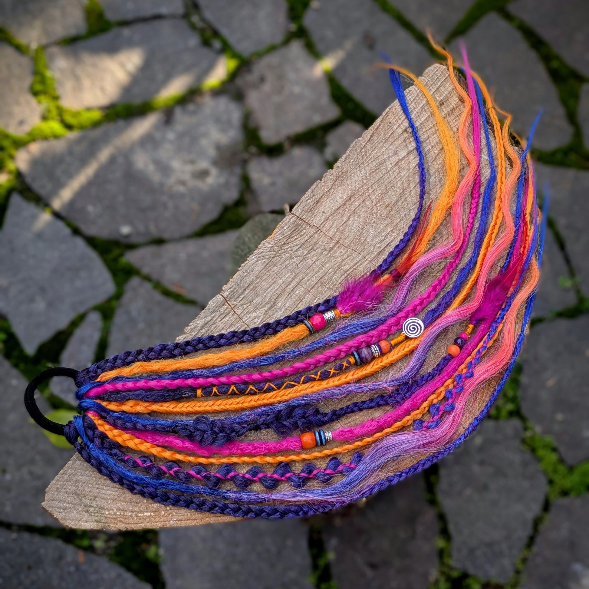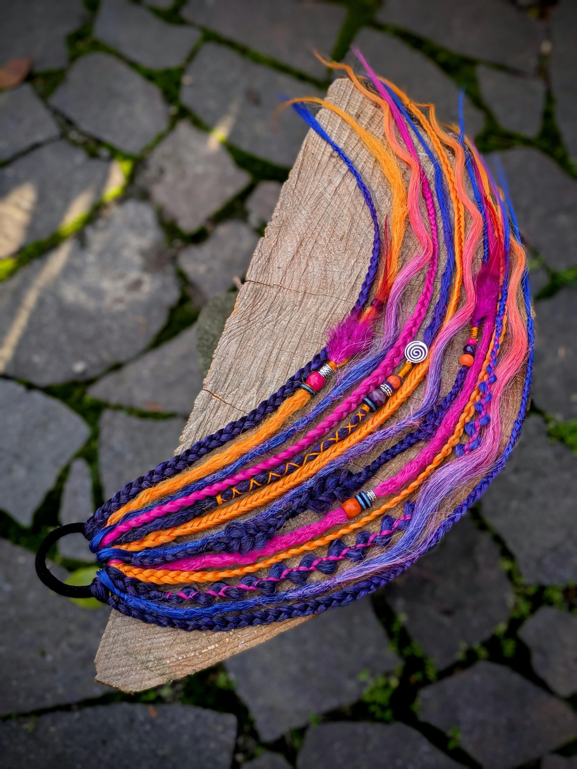 Černá gumička s dohromady 7 copánky různých struktur, 3 dreadovlnkamí a 3 dready v kombinaci modré, oranžové a magenty. Zdobeno dřevěnými a kovovými korálky, bavlnkou a pírky. délka 60 cm