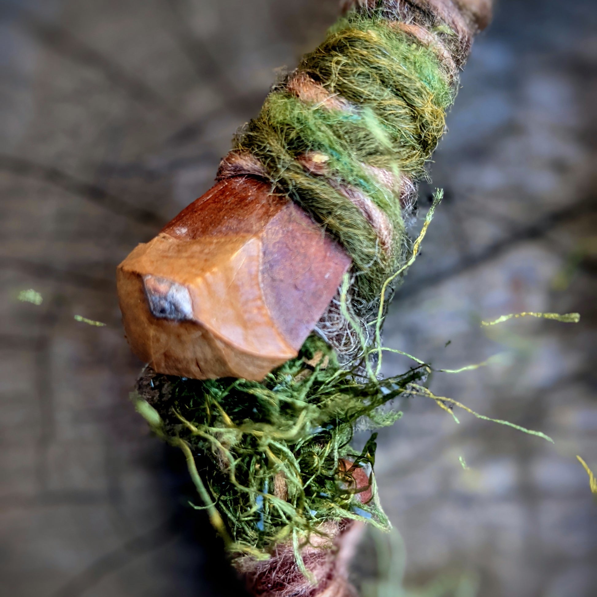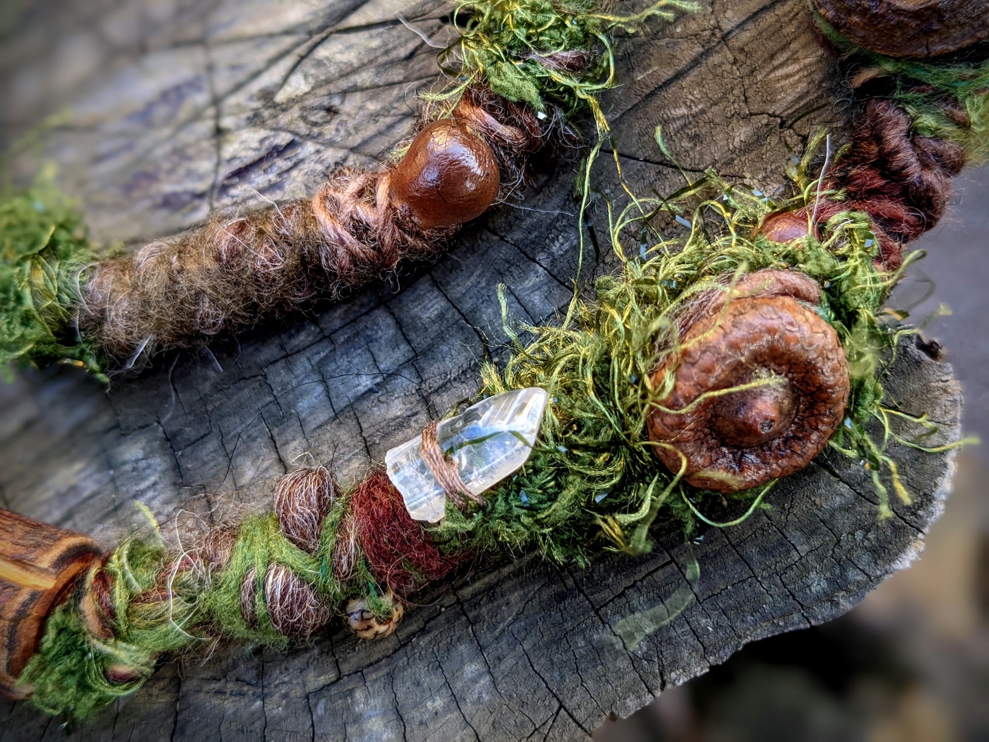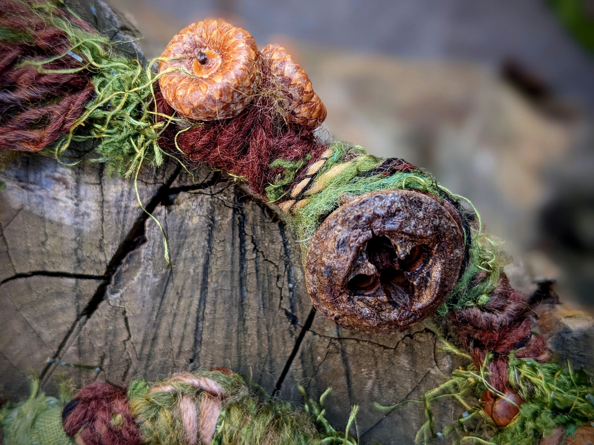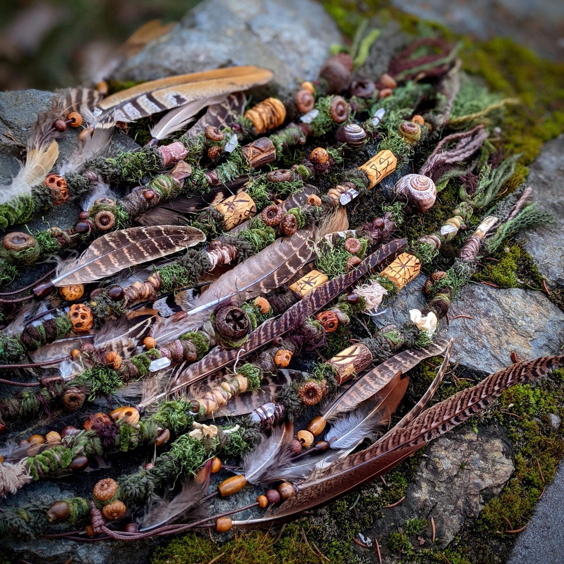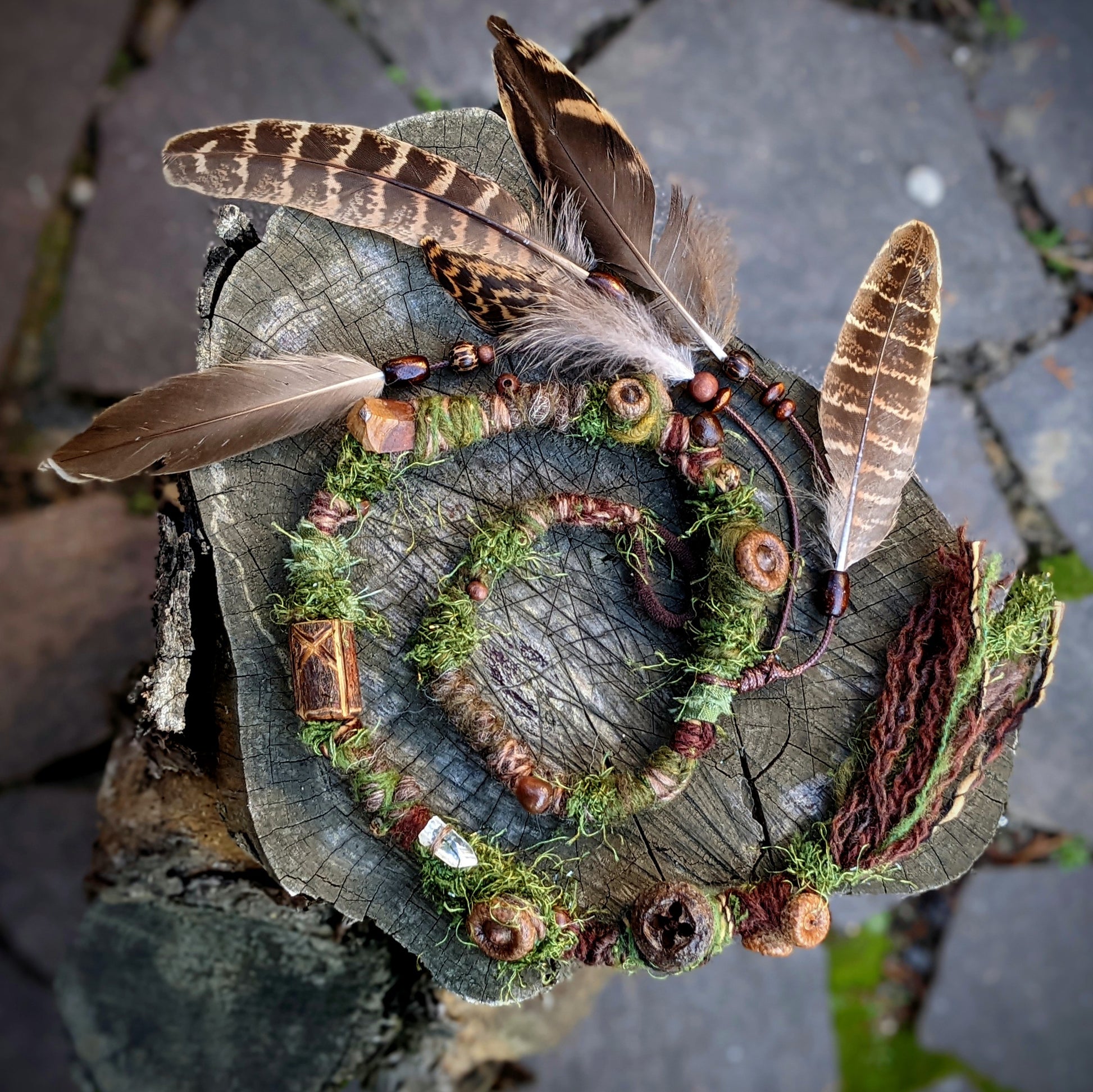Ozdobný dread s mechovou strukturou vyrobený z příze, ovčí vlny a recyklovaných látek. Zdobeno žaludy, klokočím, šiškovým lupínkem, dřevěnými korálkami, korálkami ze semínek, krystalem, vypalovanou dřevěnou korálkou a pírkovým závěsem, který jde z dreadu sundat a použít i samostatně jako pírková ozdoba do vlasů/dreadů.