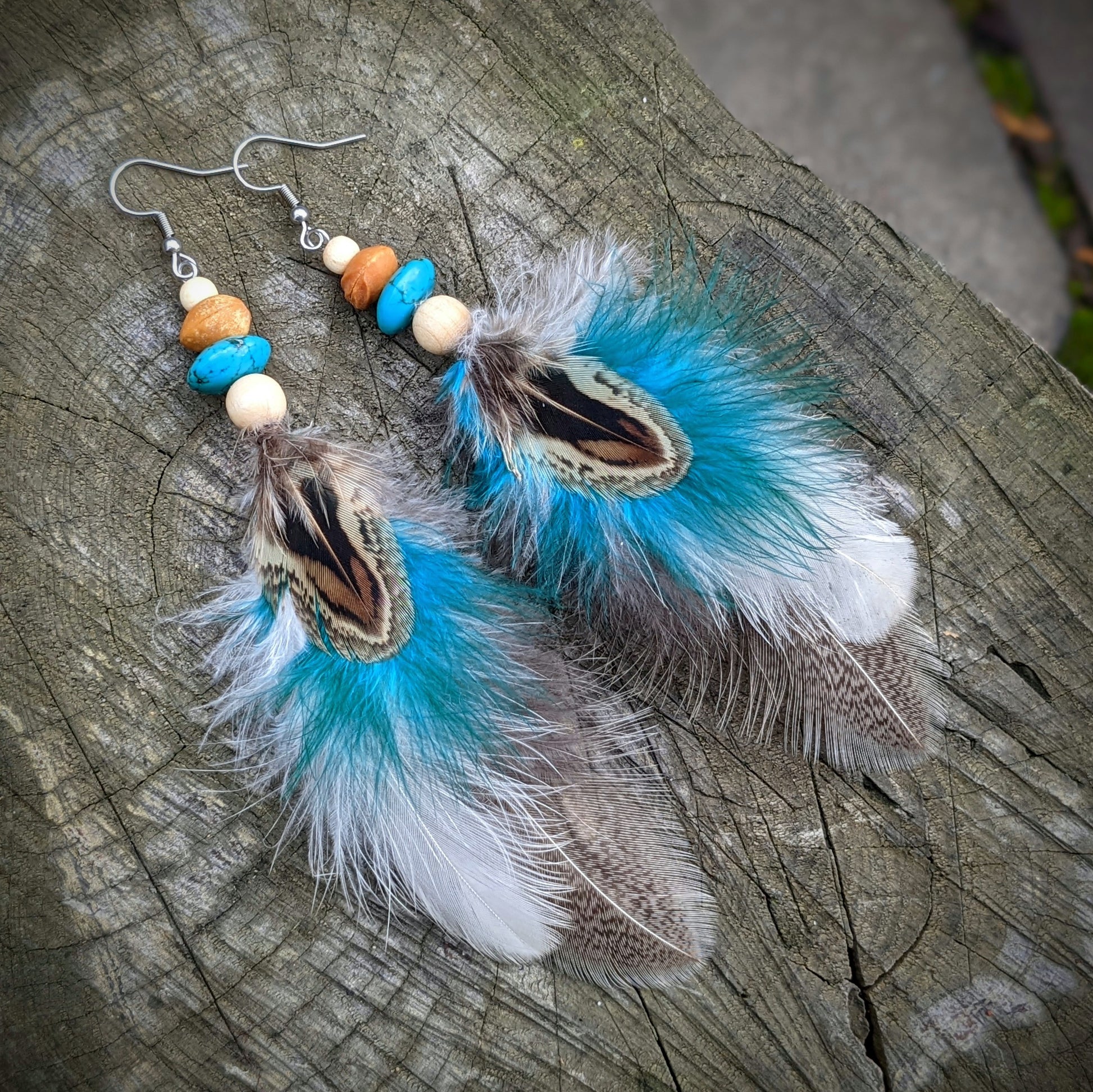 Lehoučké peříčkové vílí náušnice s barevnými pírky, doplněné dřevěnými, třešňovými a tyrkenitovými korálkami. Háčky jsou z chirurgické oceli, dodávám se silikonovými zarážkami. Délka ozdobné části náušnic je cca 11 cm.