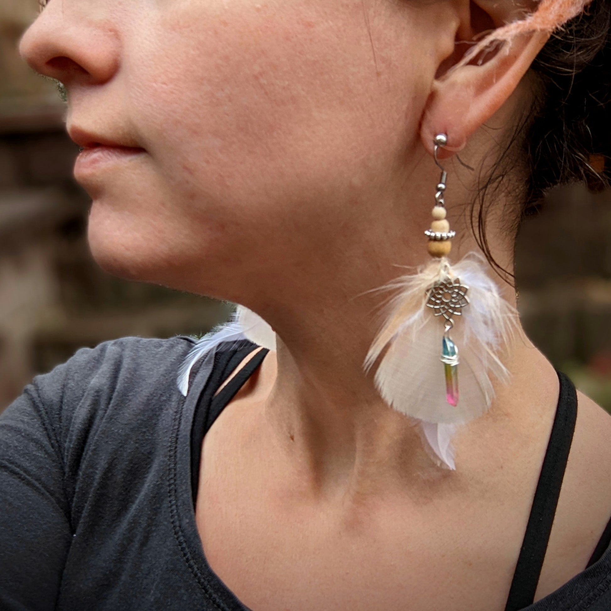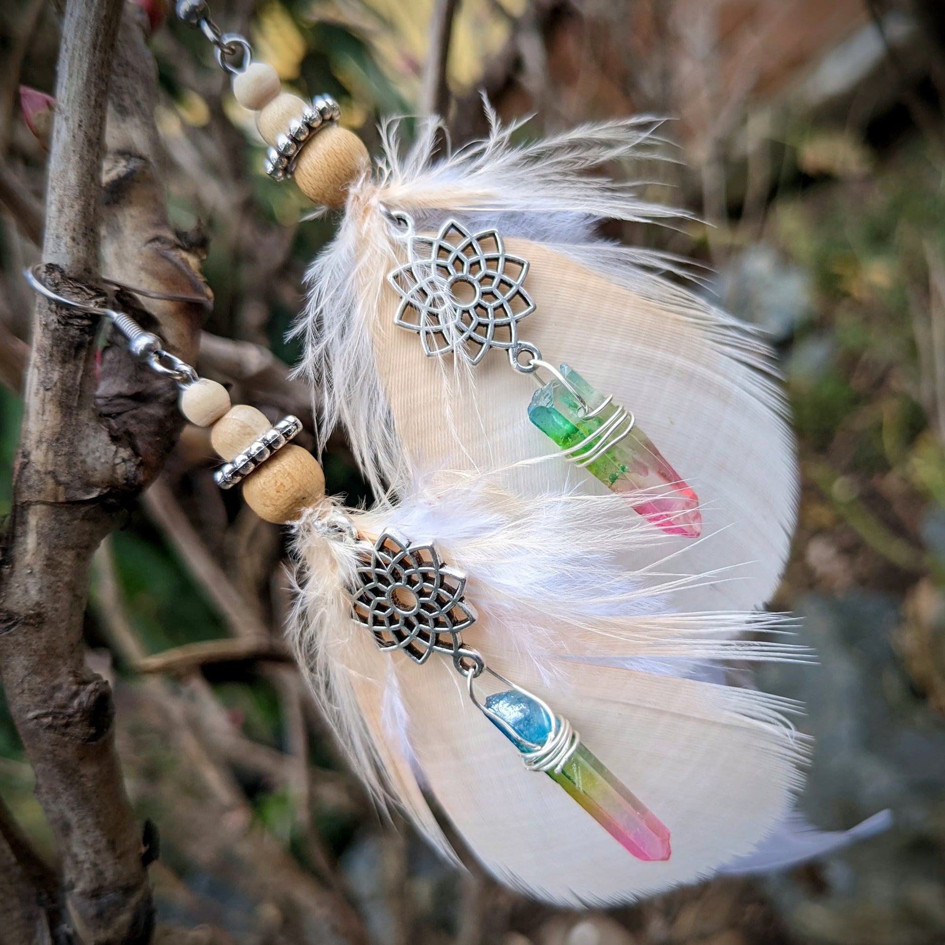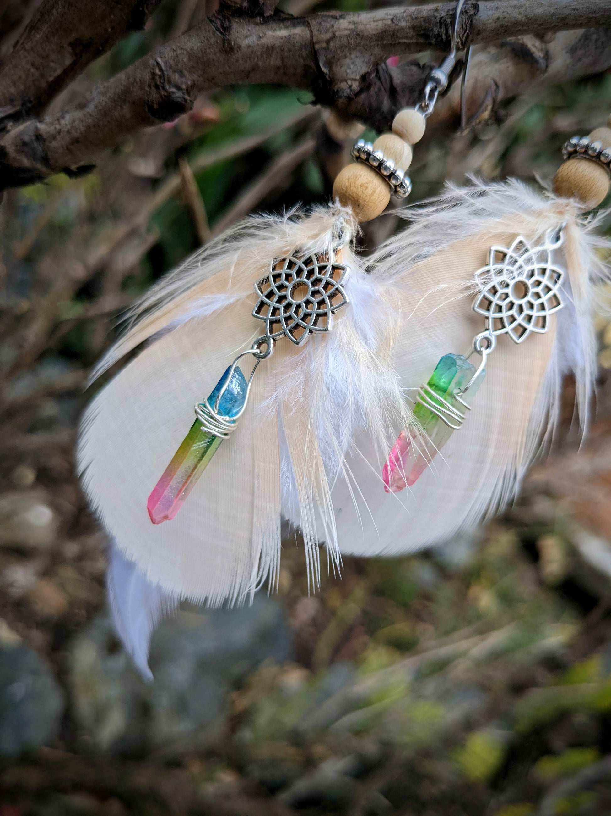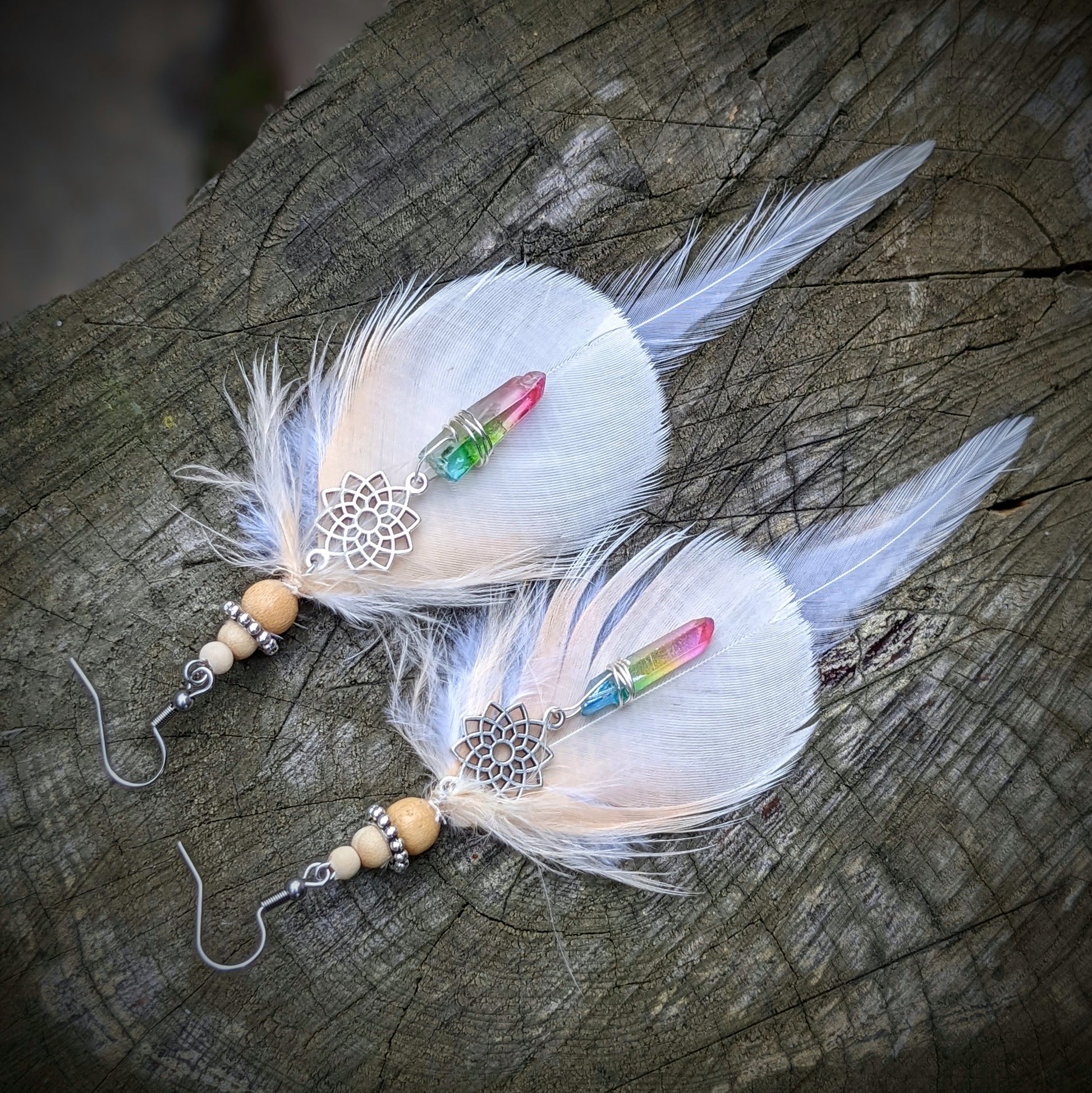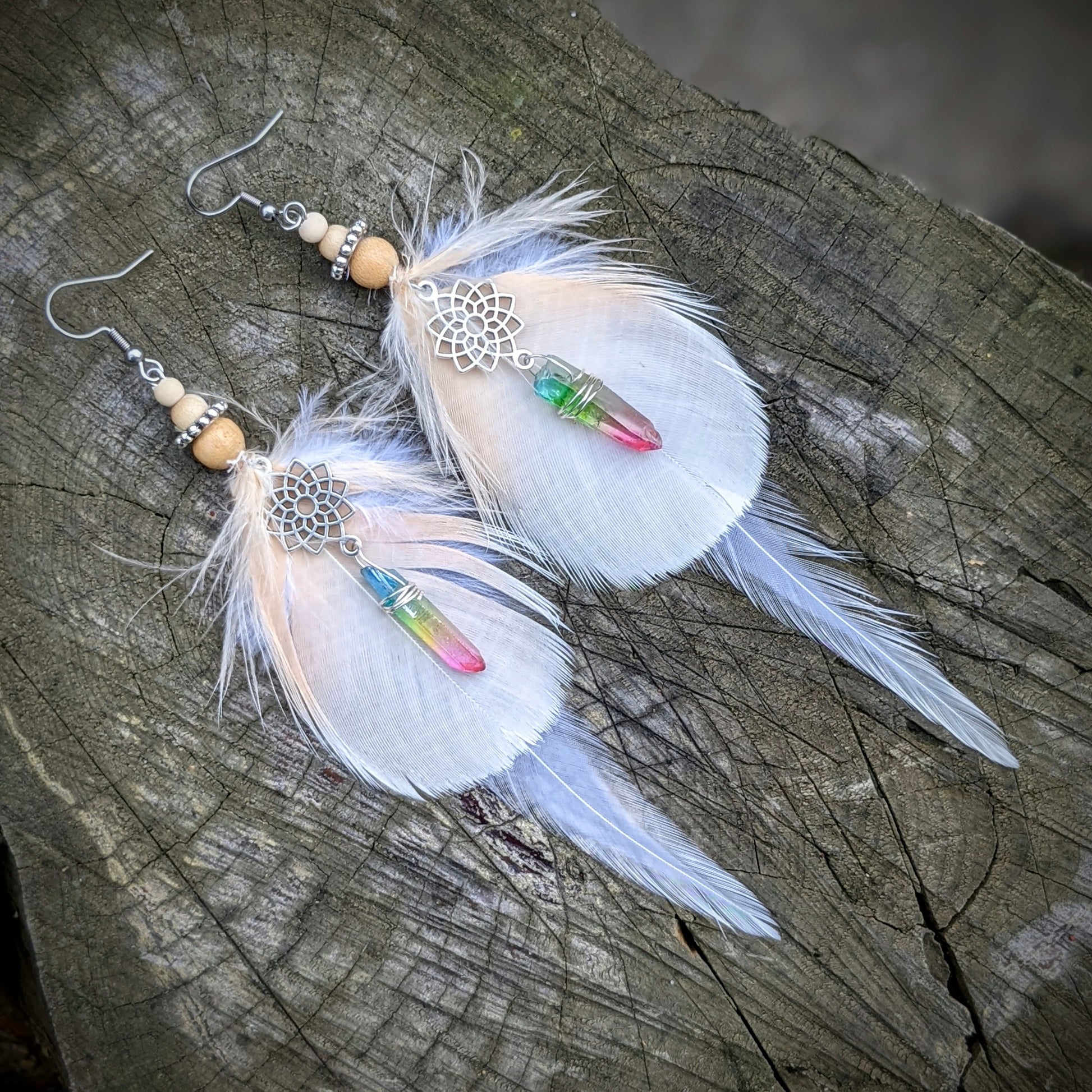 Jemné peříčkové náušnice (papoušek, kohout...) s mandalou doplněné duhovými krystaly a dřevěnými a kovovými korálkami. Háčky jsou z chirurgické oceli, dodávám se silikonovými zarážkami. Délka ozdobné části náušnic je cca 14 cm.