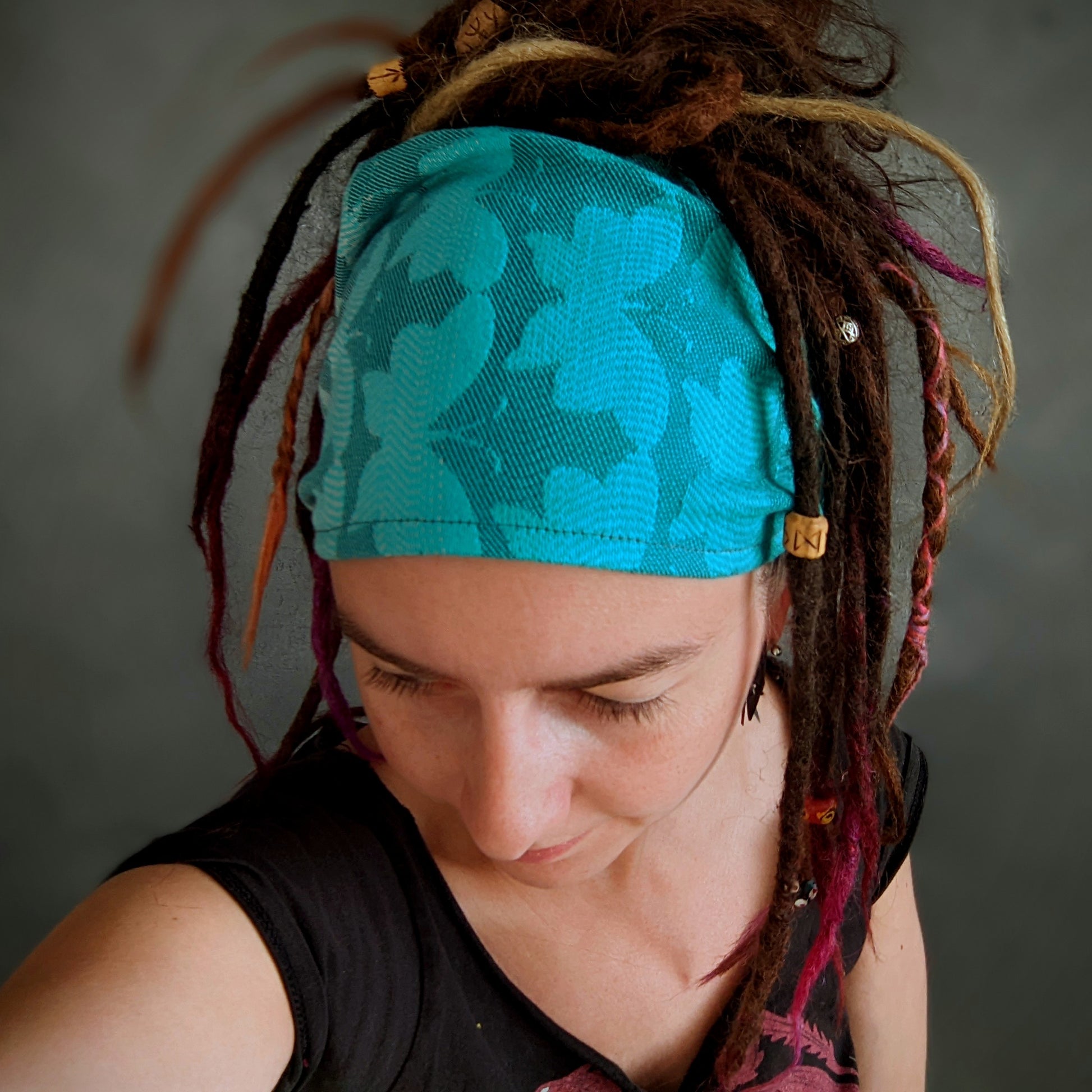 Praktická šátková čelenka šitá z odstřižku z šátku na nošení dětí.