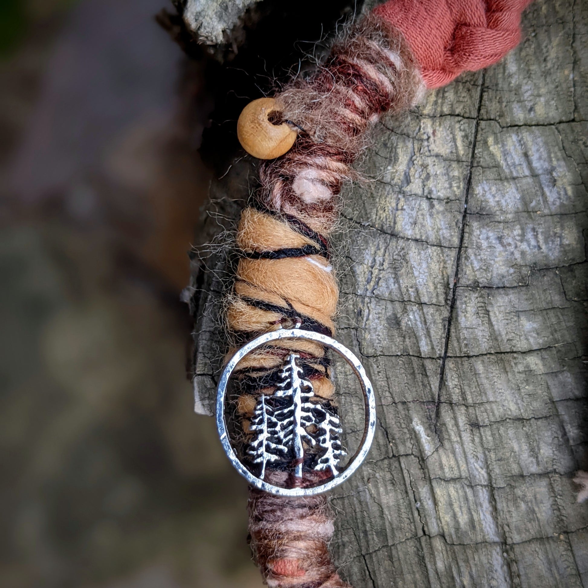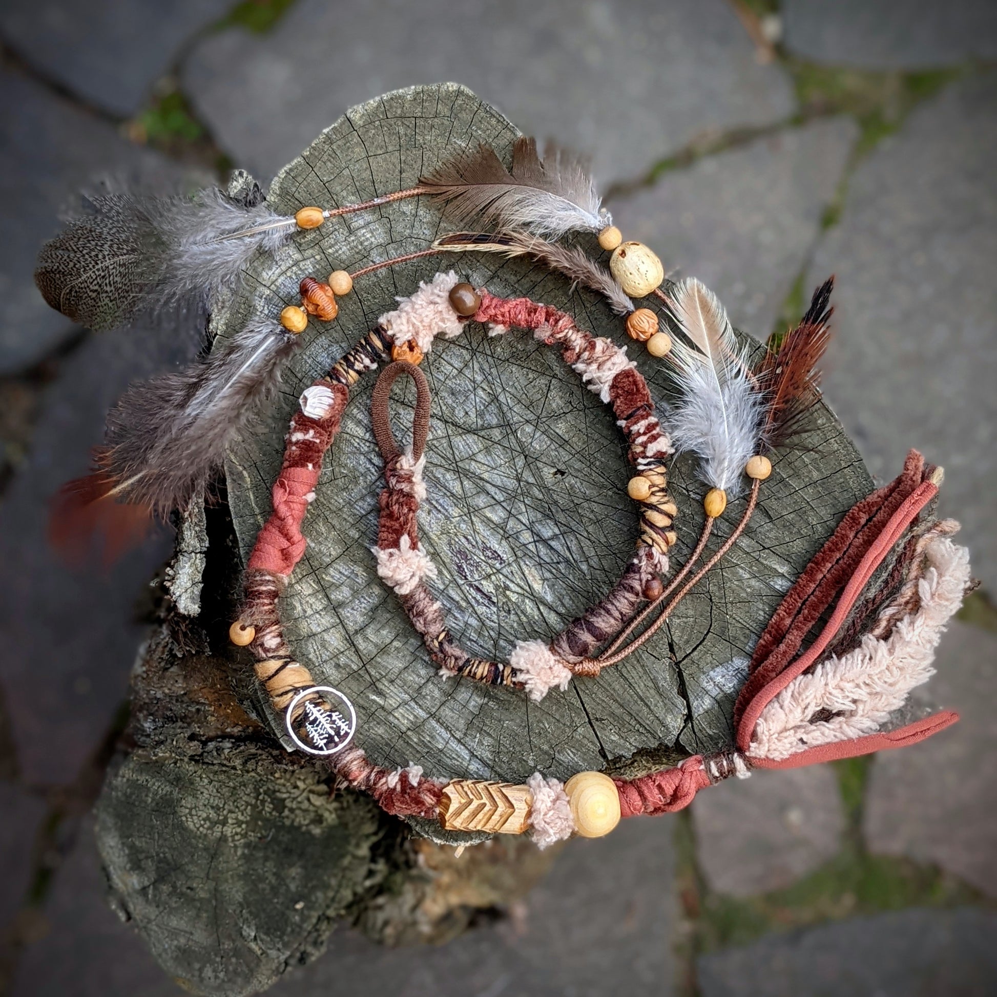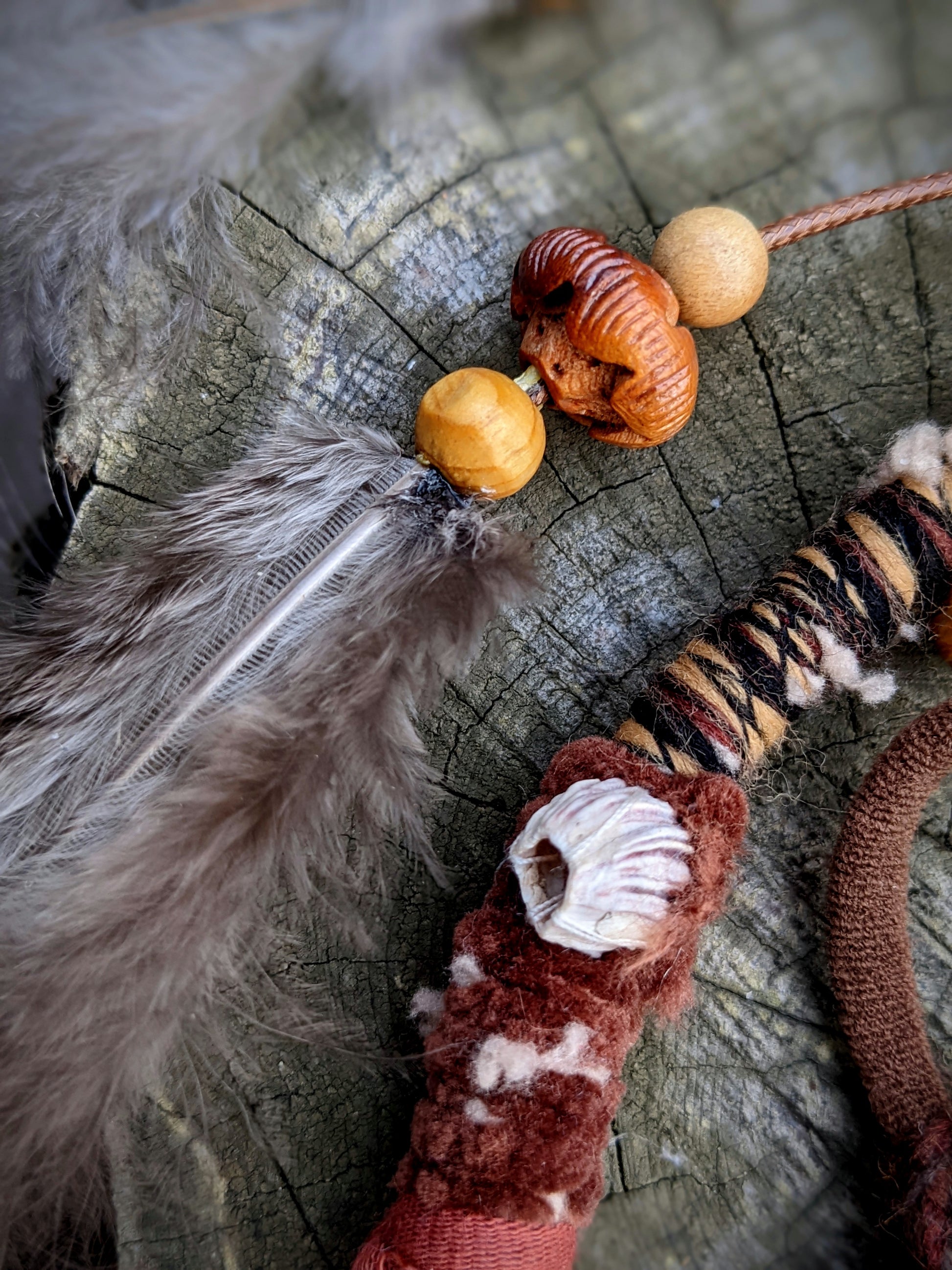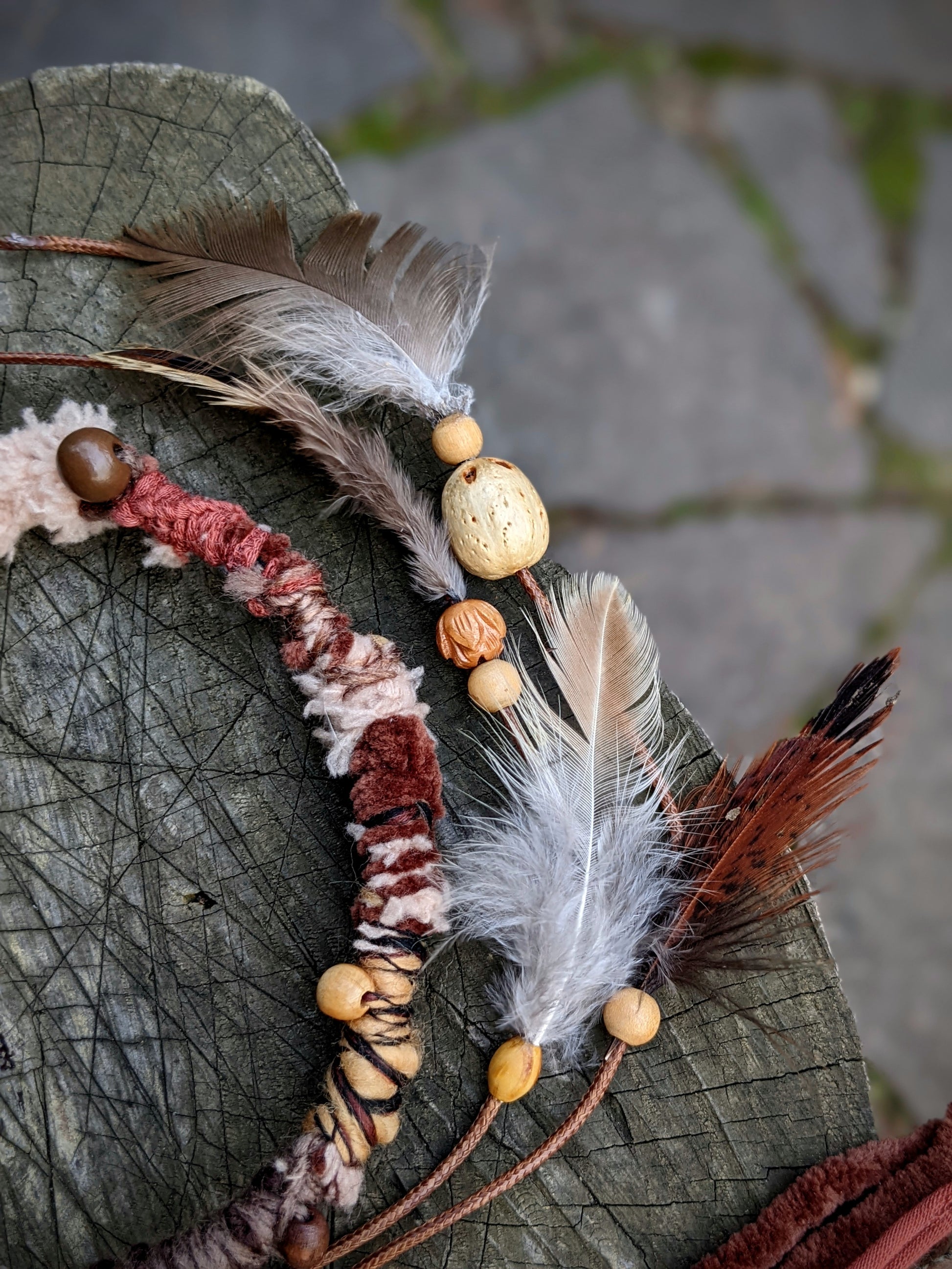 Ozdobný dread vyrobený z příze a recyklovaných látek. Zdobeno dřevěnými, korálkami, mušličkou a pírkovým závěsem, který jde z dreadu sundat a použít i samostatně jako pírková ozdoba do vlasů/dreadů.