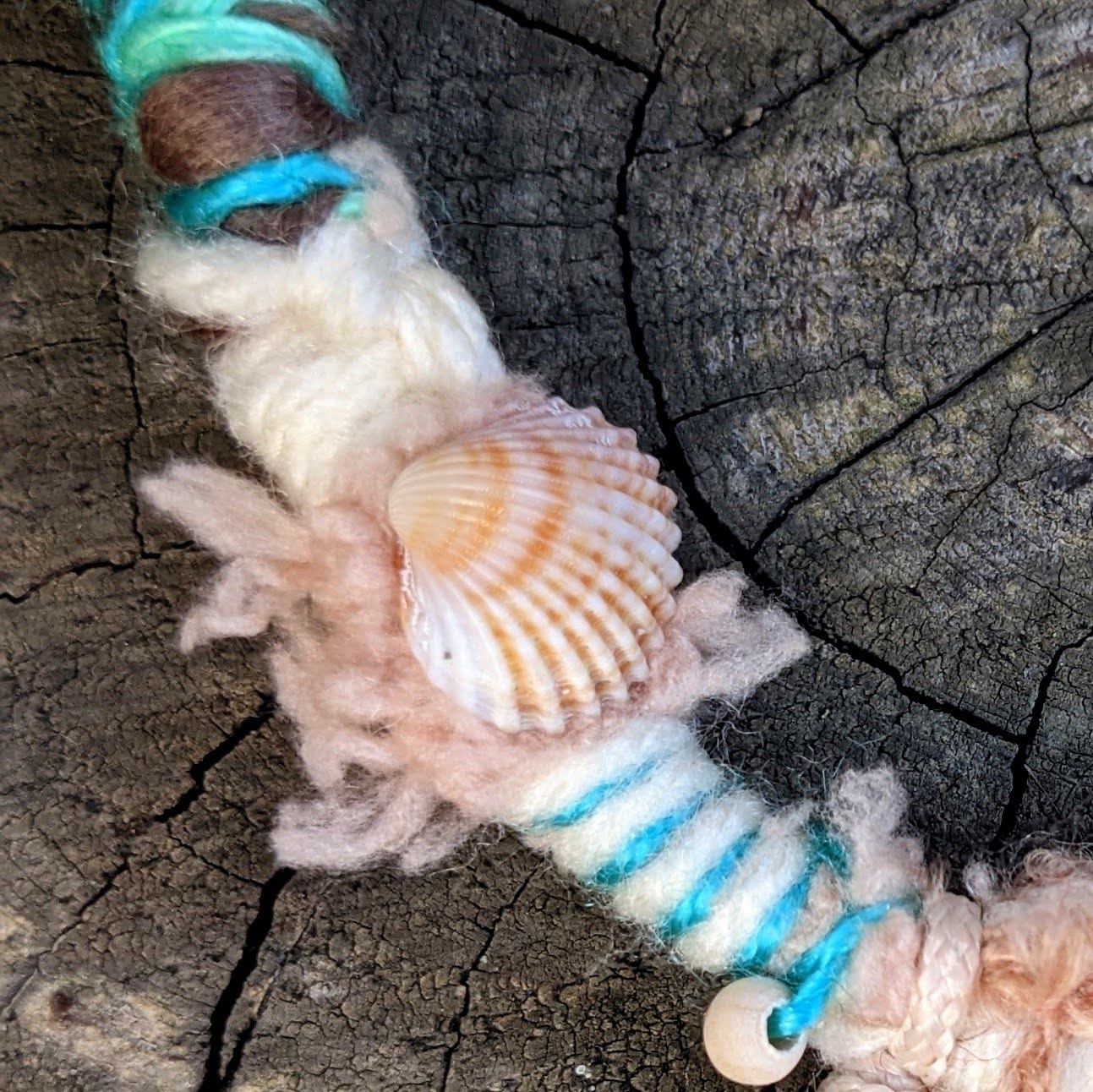 Ozdobný dread vyrobený z příze a recyklovaných látek. Zdobeno dřevěnými a kostěnými korálkami, pravými perlami, mušličkami a pírkovým závěsem, který jde z dreadu sundat a použít i samostatně jako pírková ozdoba do vlasů/dreadů.