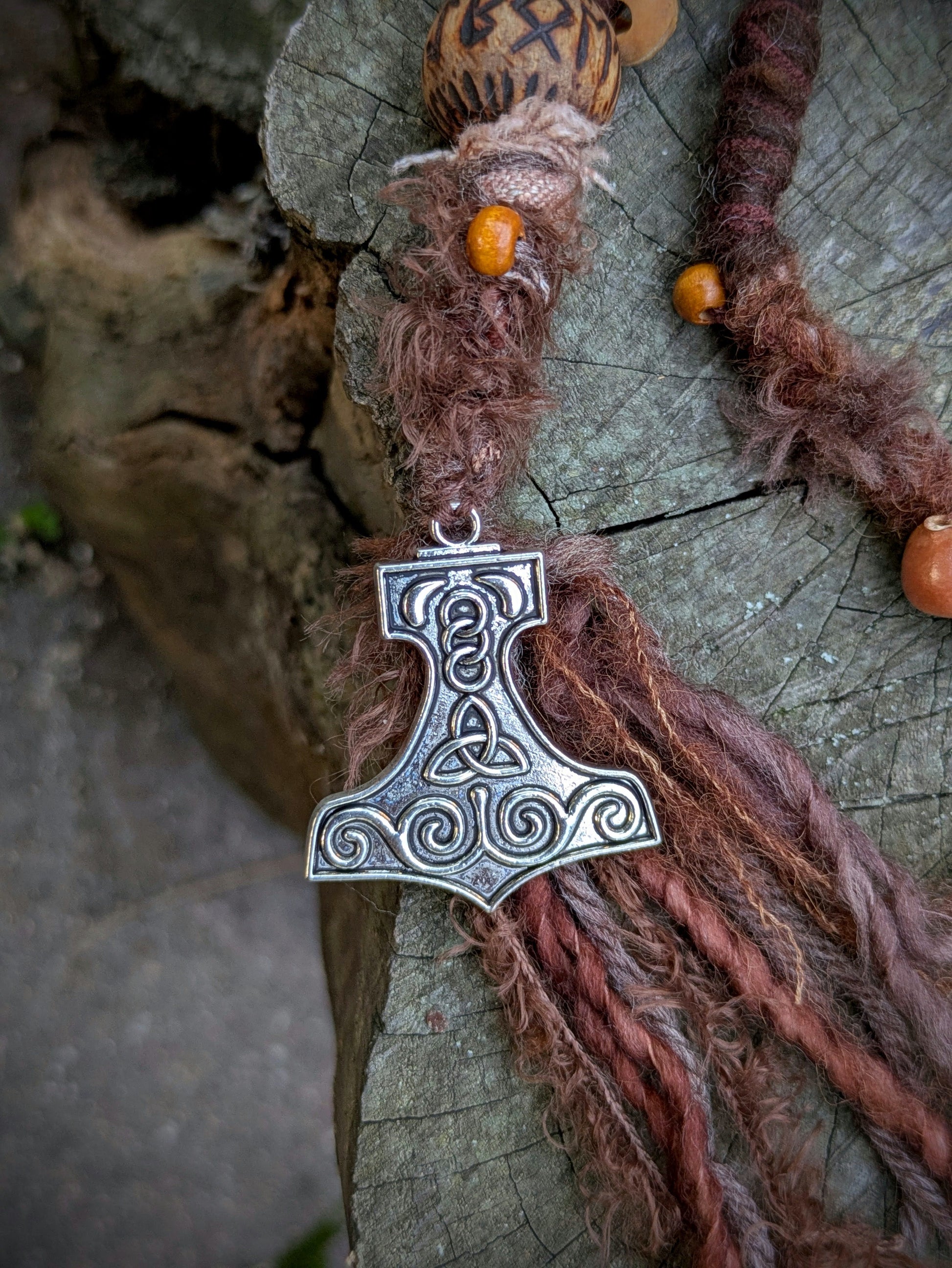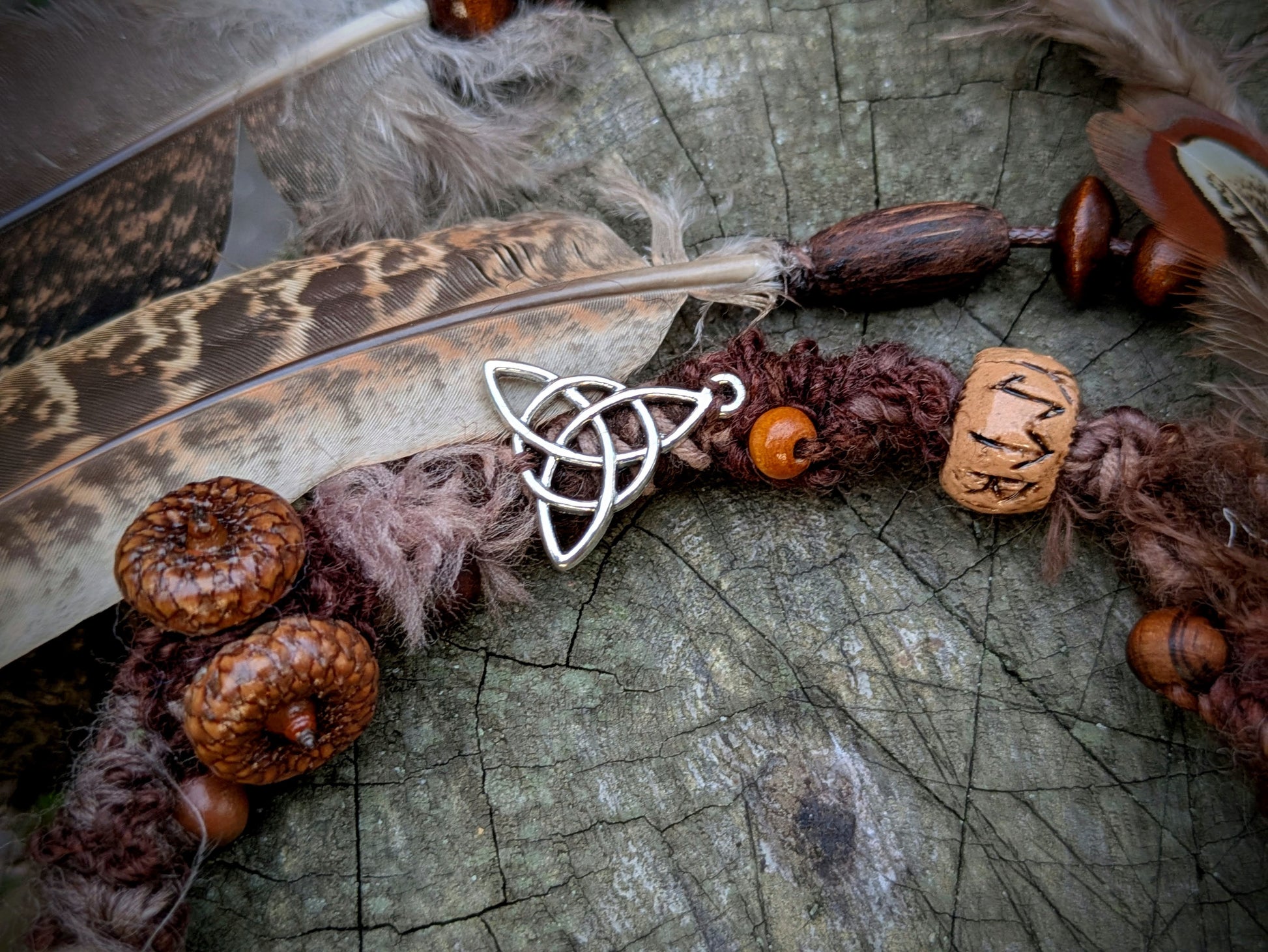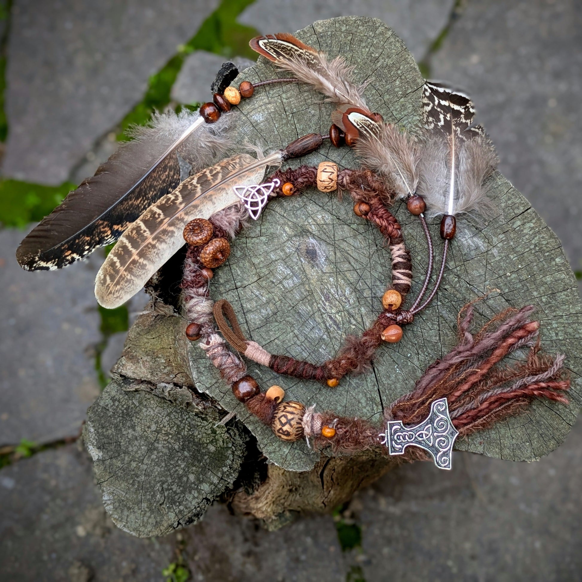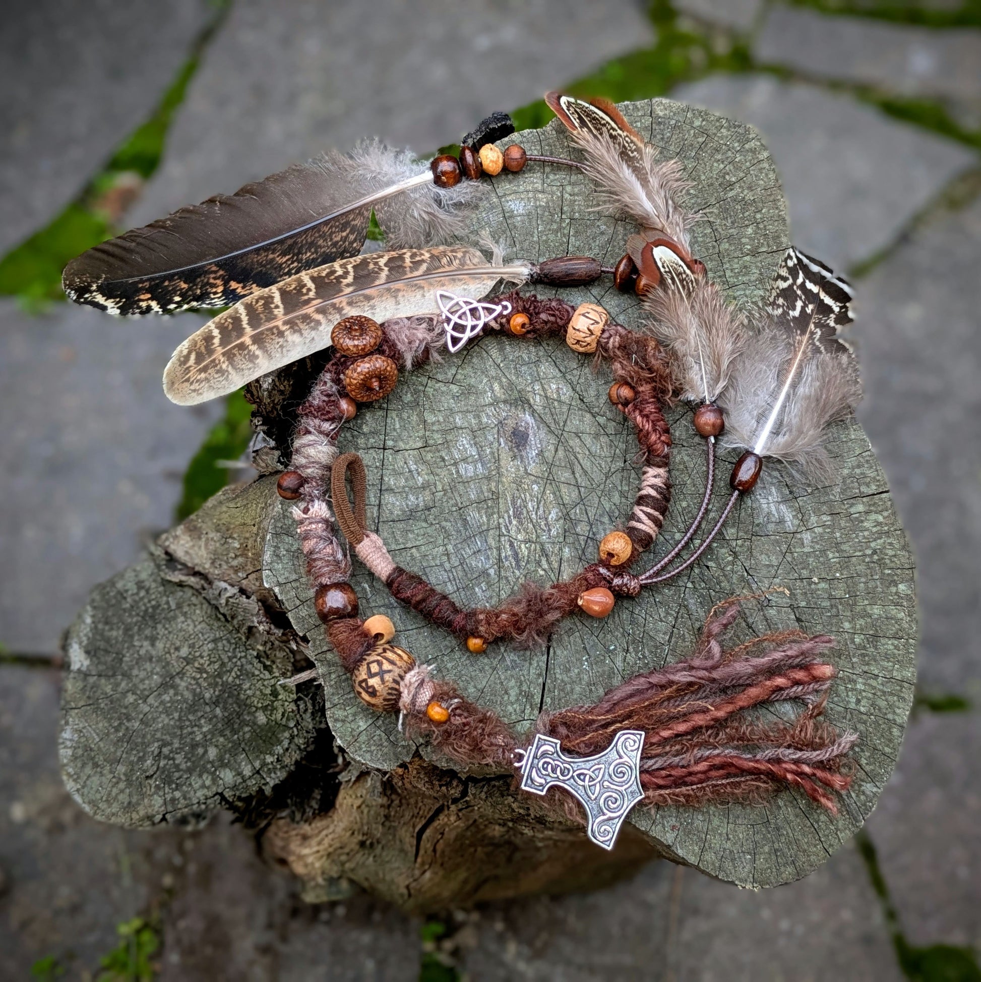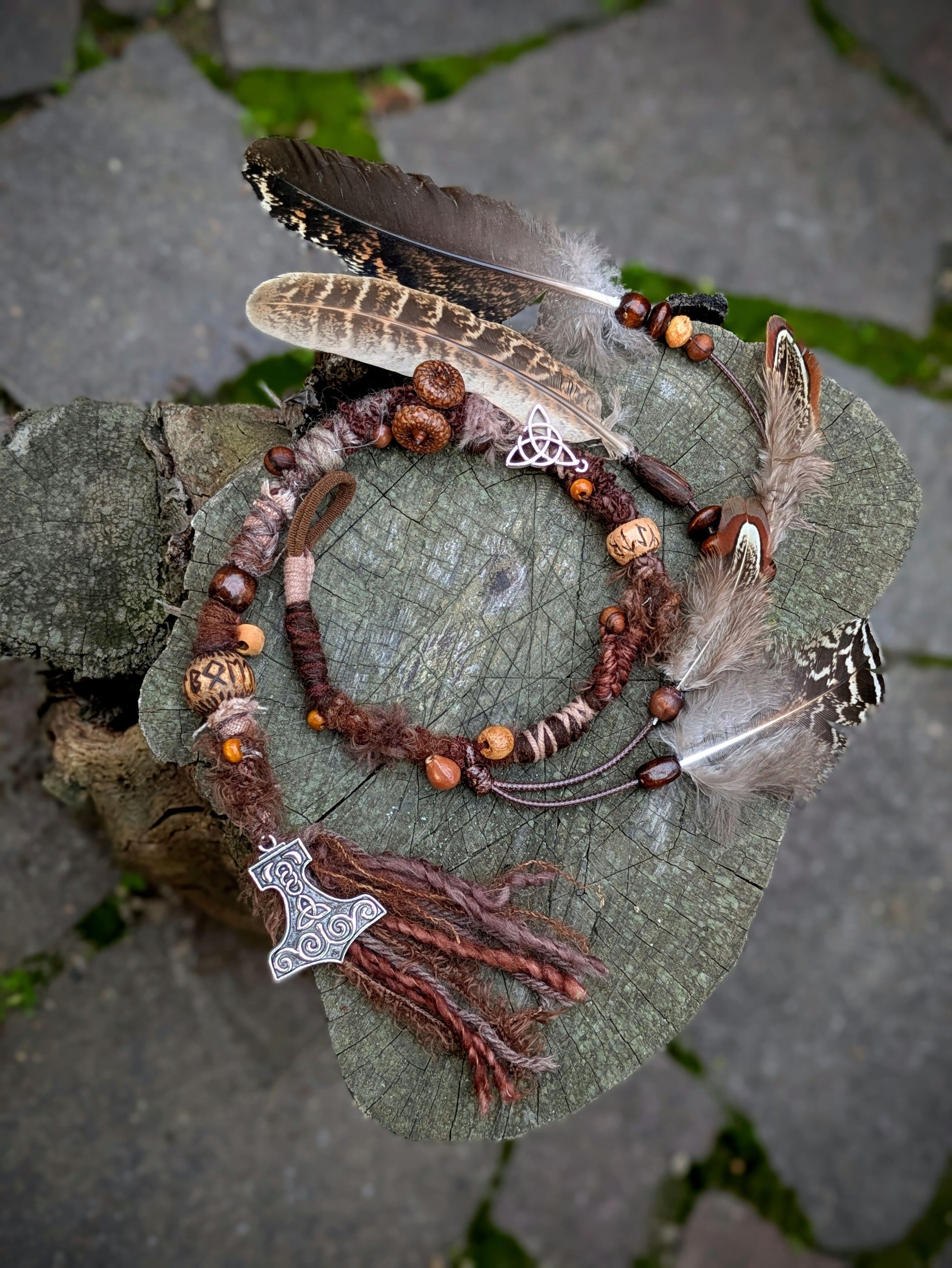Ozdobný dread v zemitých odstínech vyrobený z příze, merino vlny a recyklovaných látek. Zdobeno dřevěnými a semínkovými korálky, žaludy, Thorovým kladivem a pírkovým závěsem, který jde z dreadu sundat a použít i samostatně jako pírková ozdoba do vlasů/dreadů.