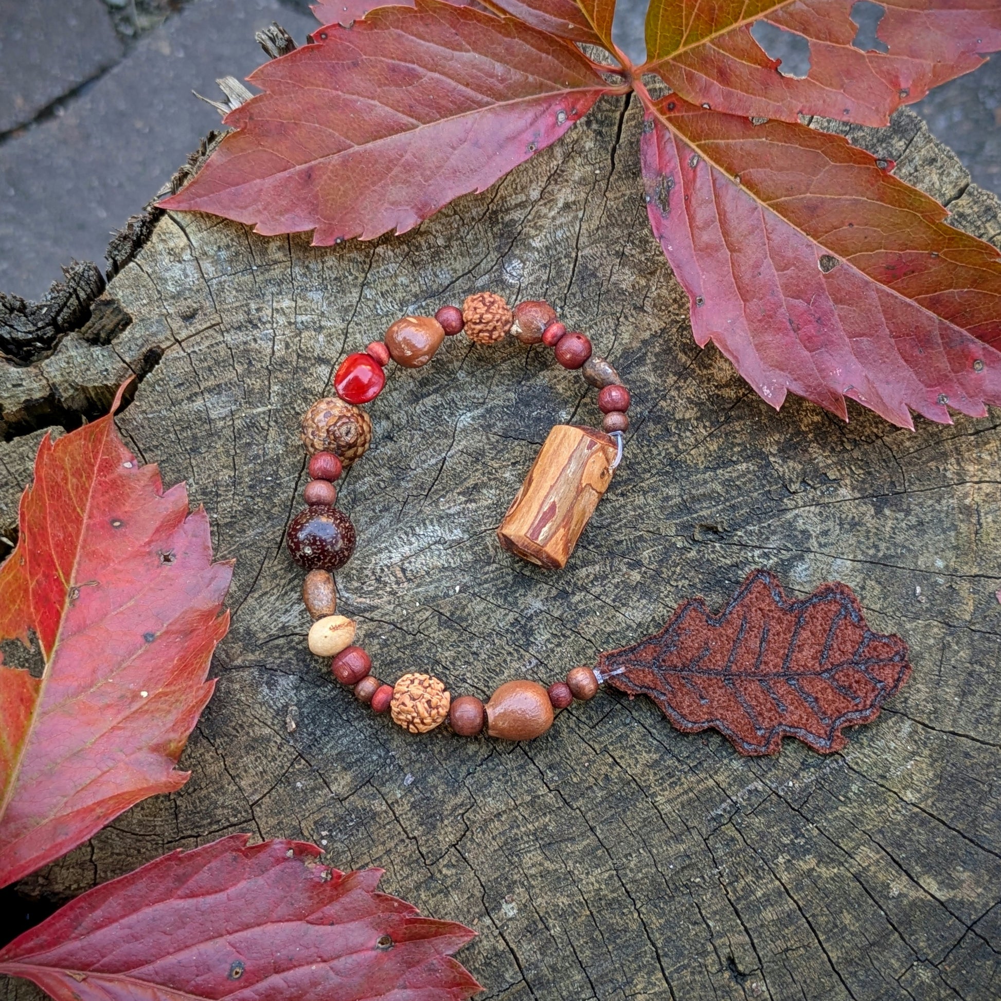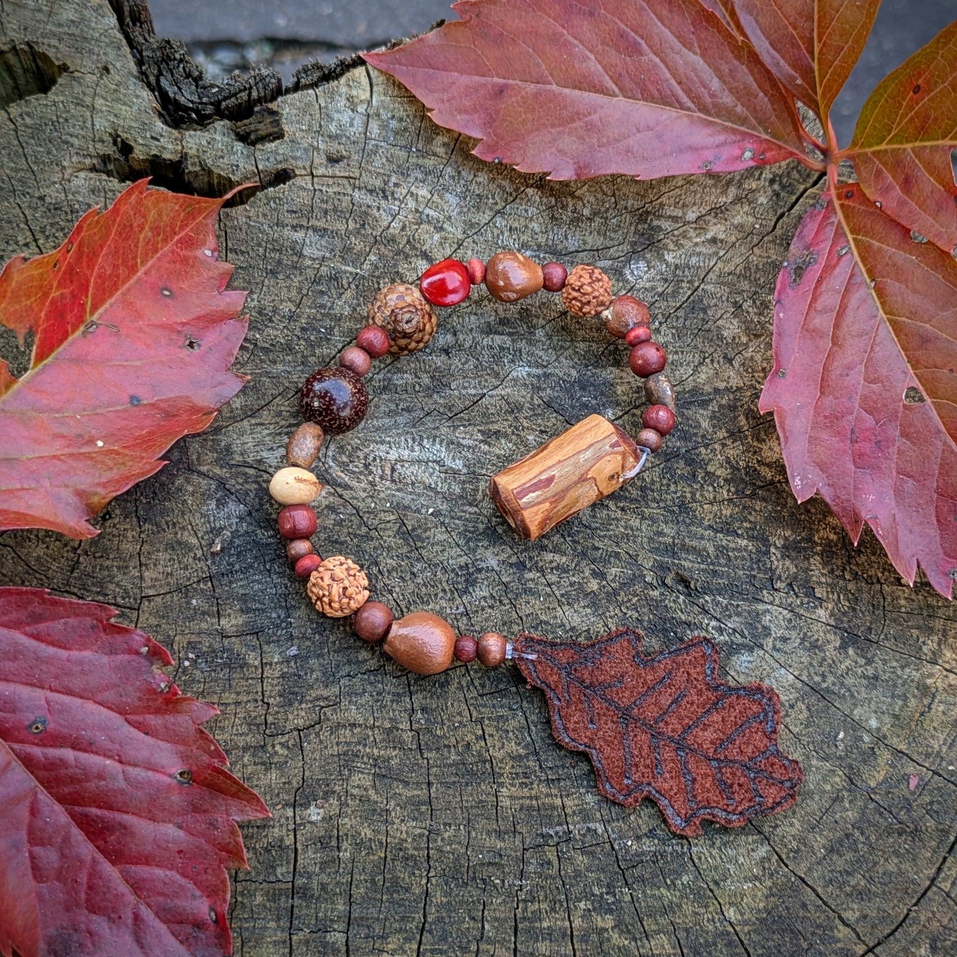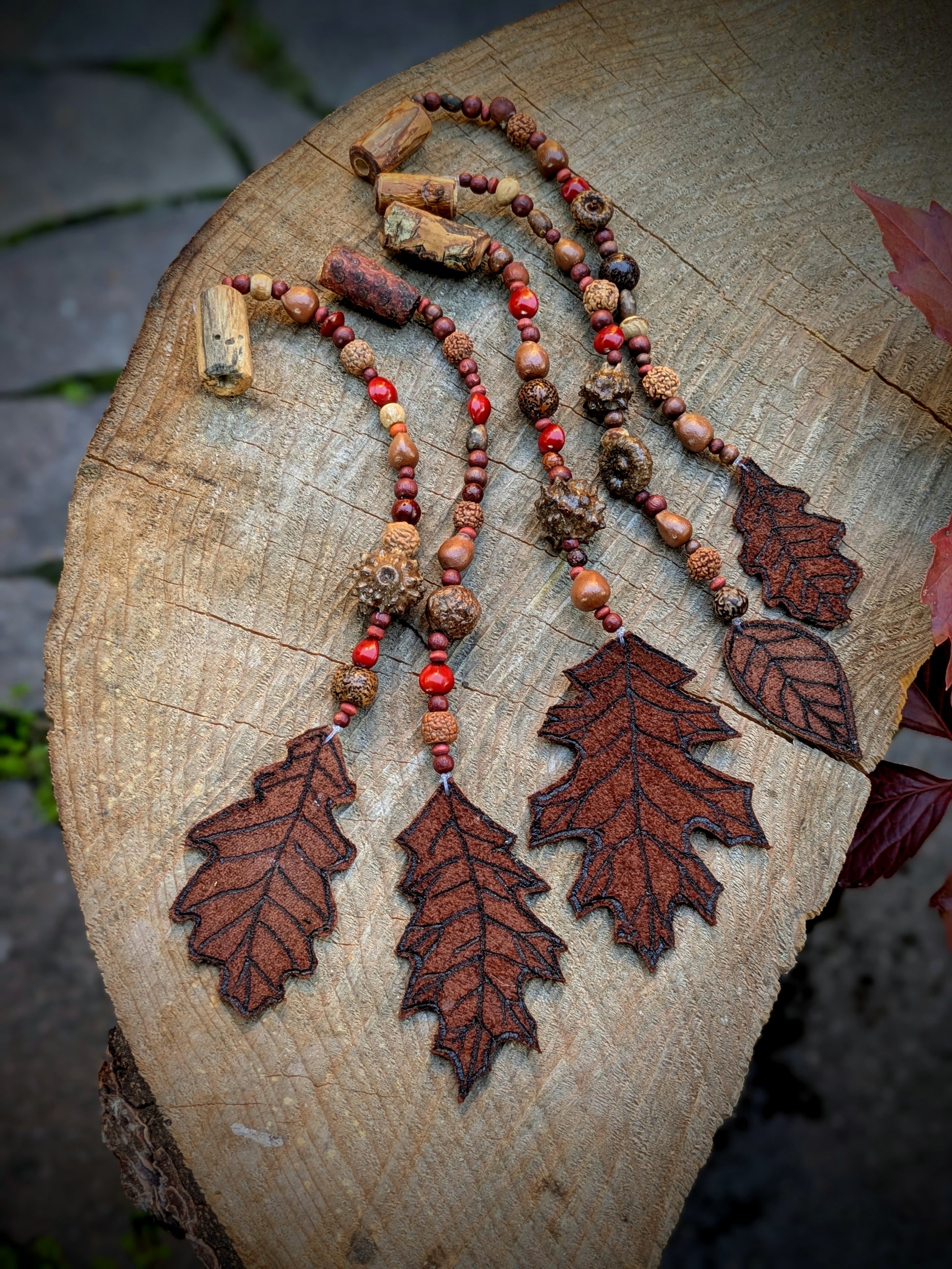 Závěs je vyrobený ze semínkových a dřevěných korálků a z korálku z pravého žaludu. Zdobeno lístkovým přívěskem ručně vypáleným do odřezku kůže. Délka visací části je 20 cm.