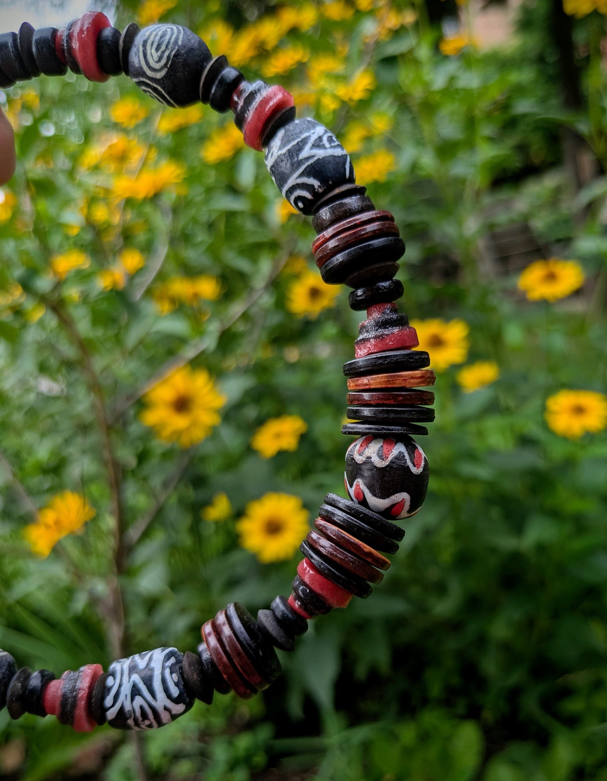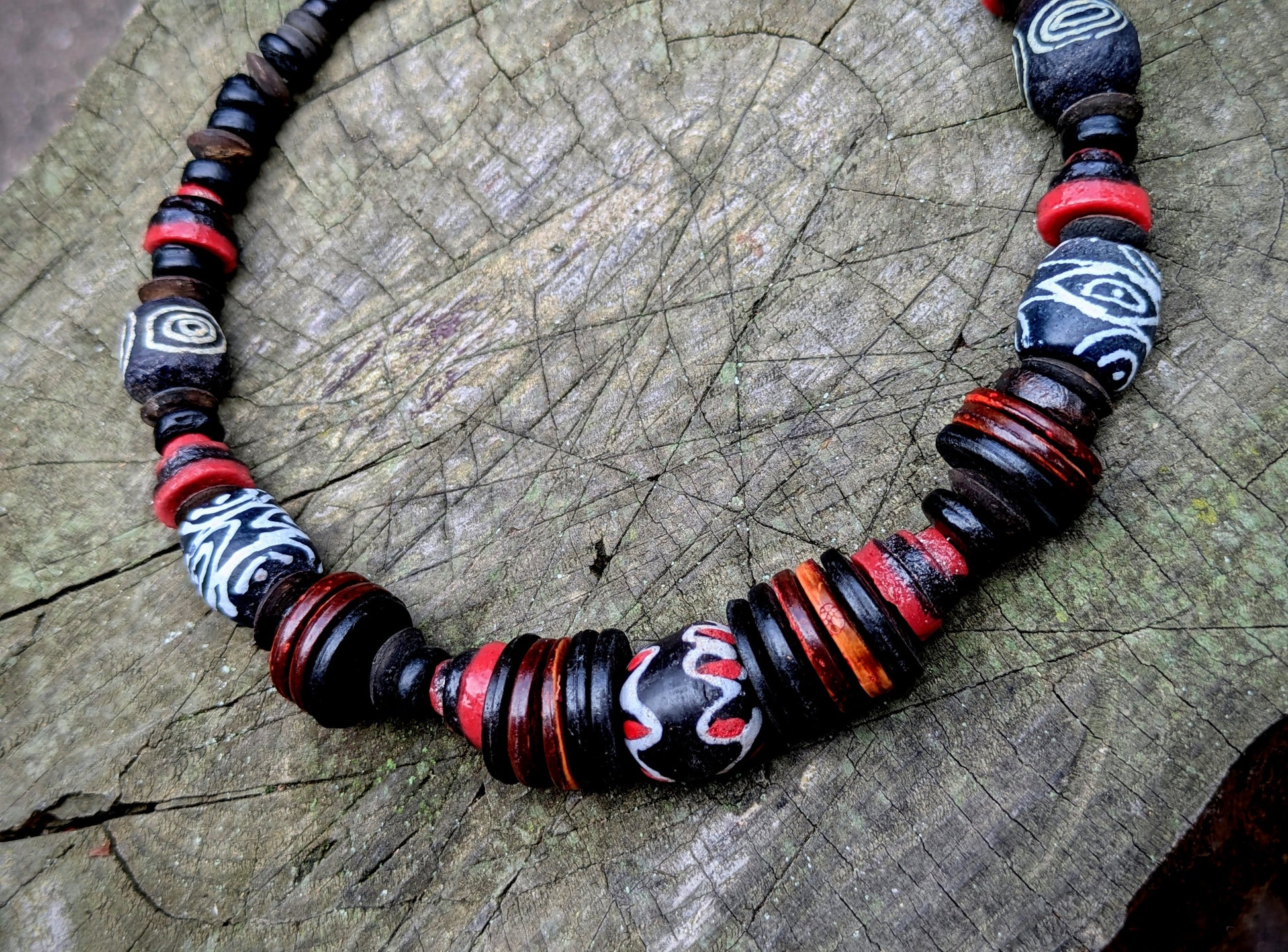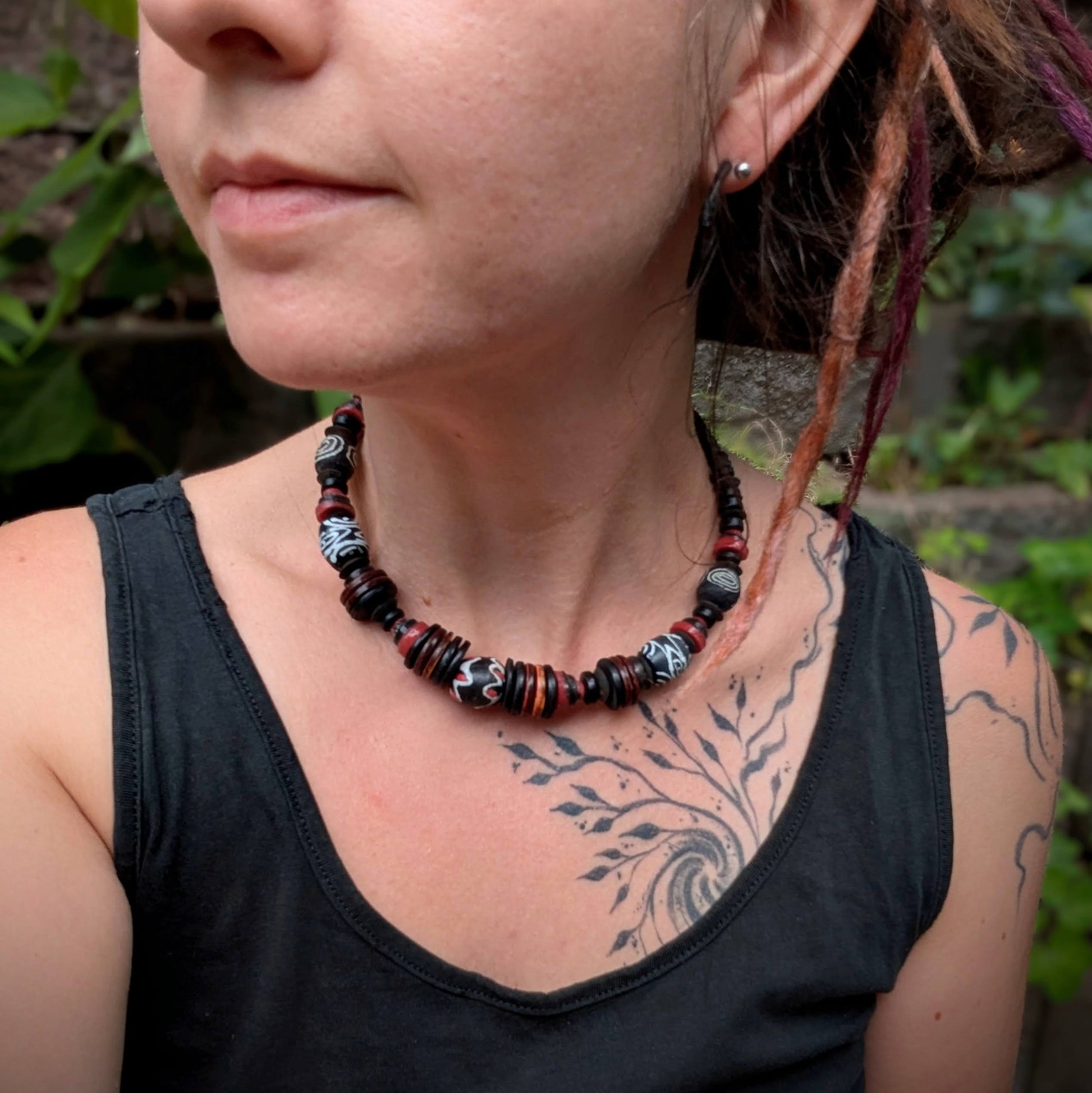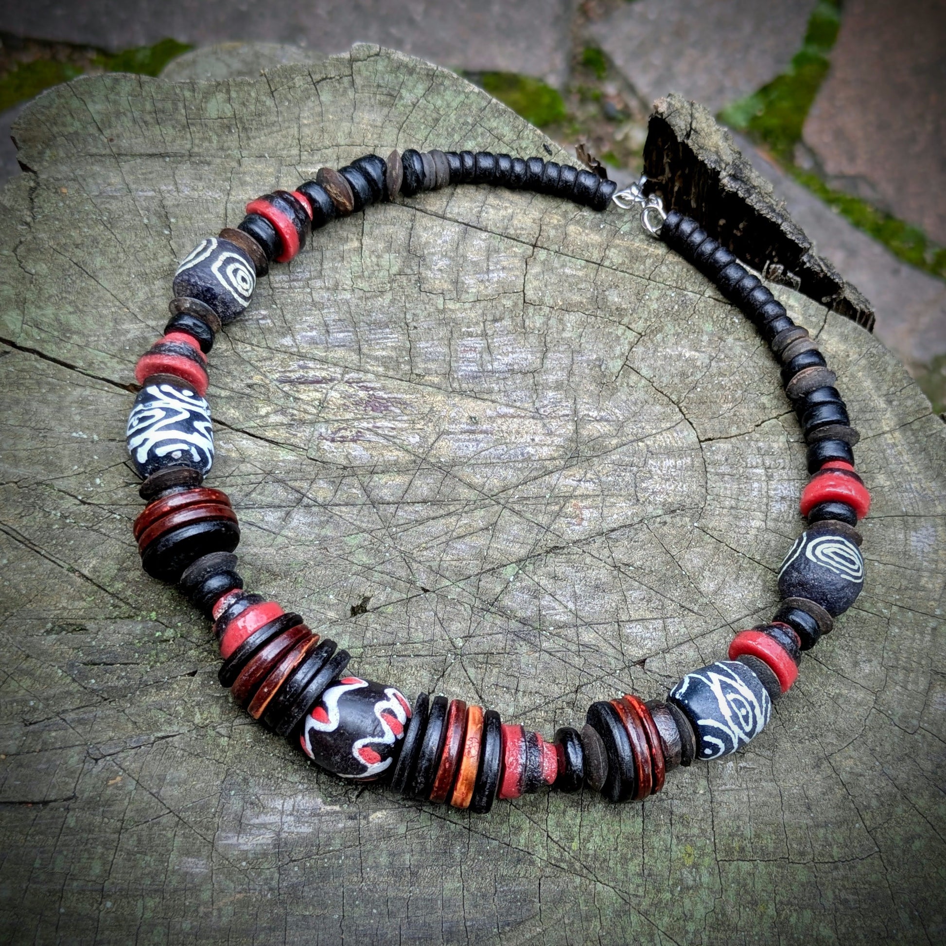 Náhrdelník je vytvořen z originálních afrických "krobo" korálků z recyklovaného skla, které se tradičně vyrábí v Ghaně, ty jsou doplněny korálky z kokosu. Navlečeno na obruči, která je určena pro obvod krku 33-38 cm - lze regulovat karabinou a řetízkem. Řetízek a karabinka je z bižuterního kovu.