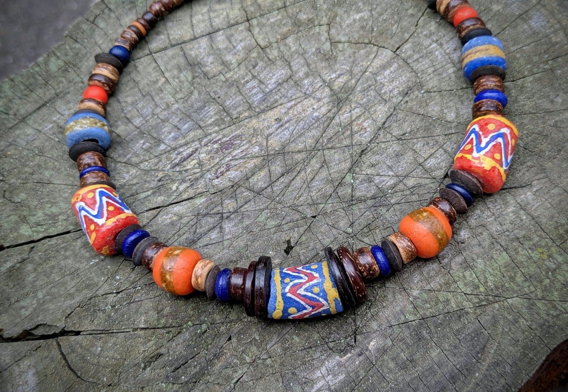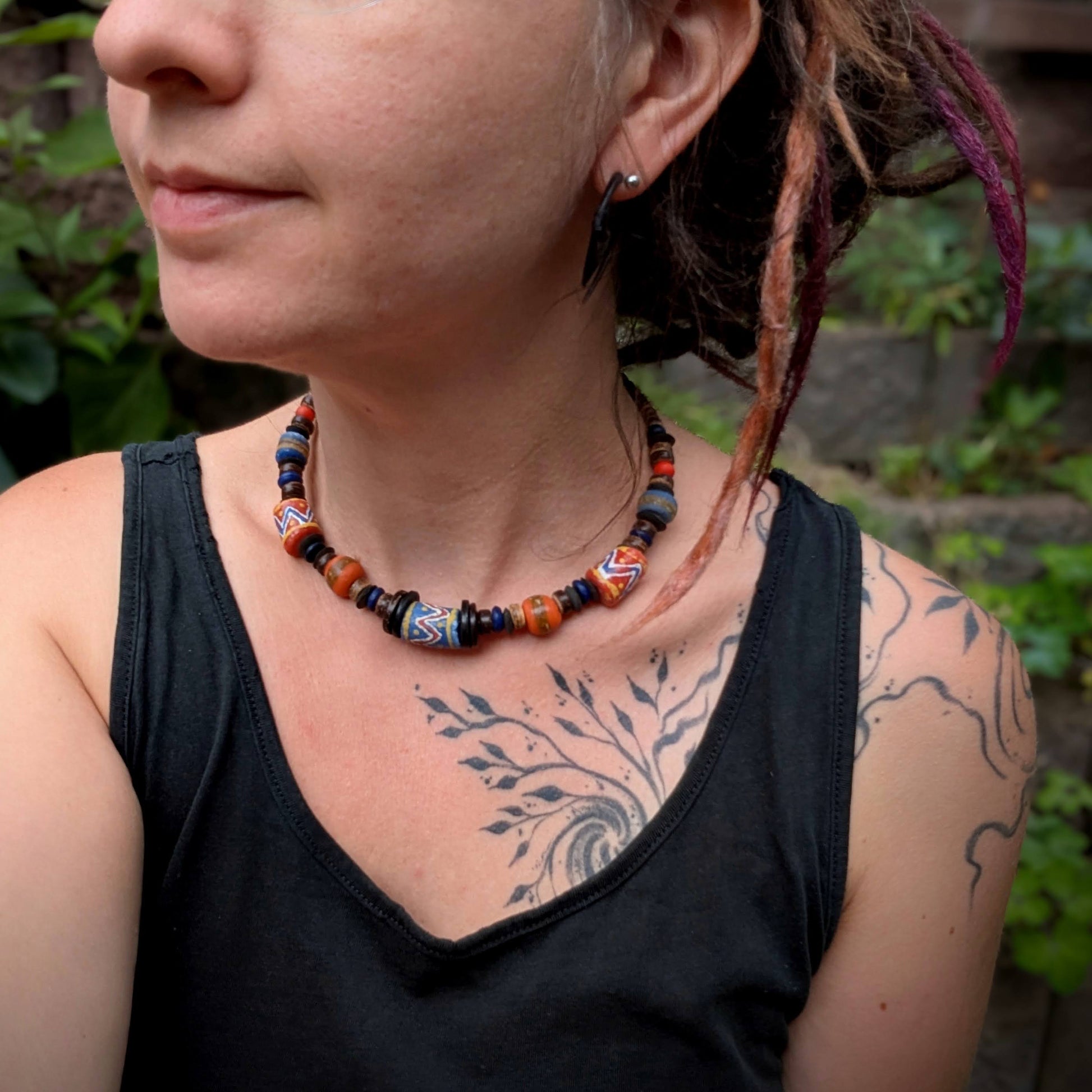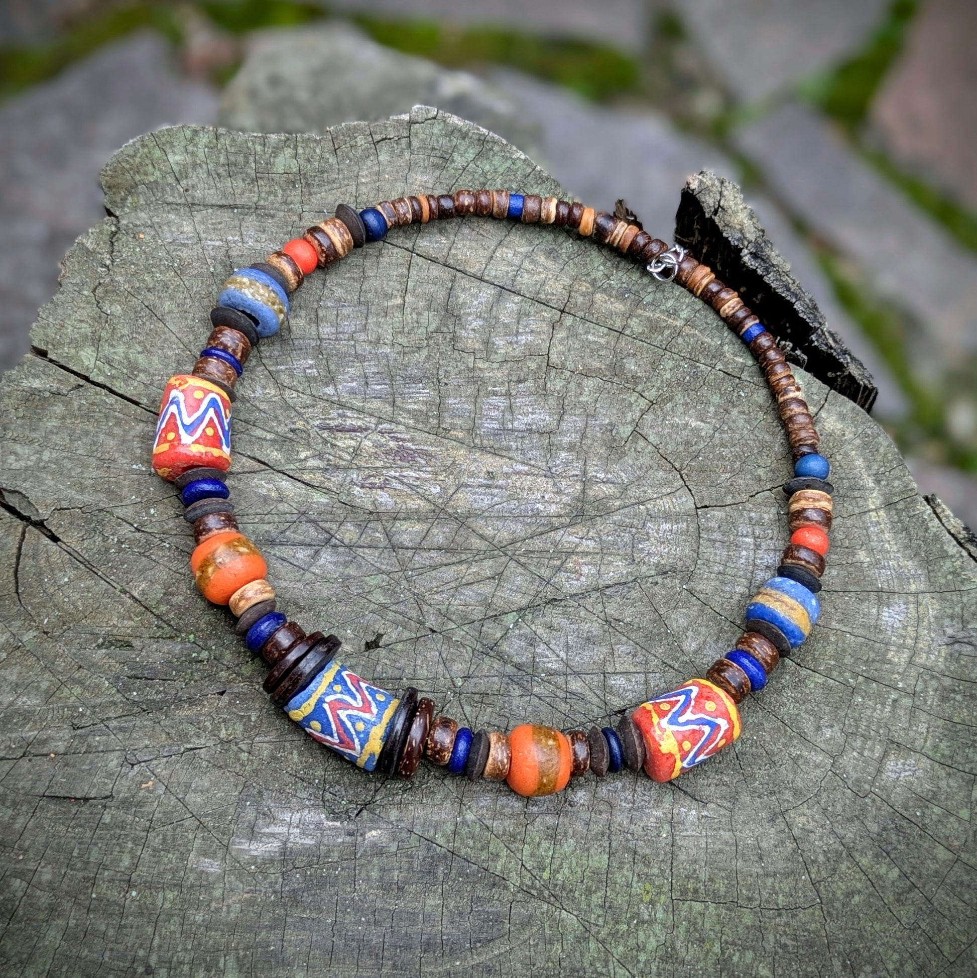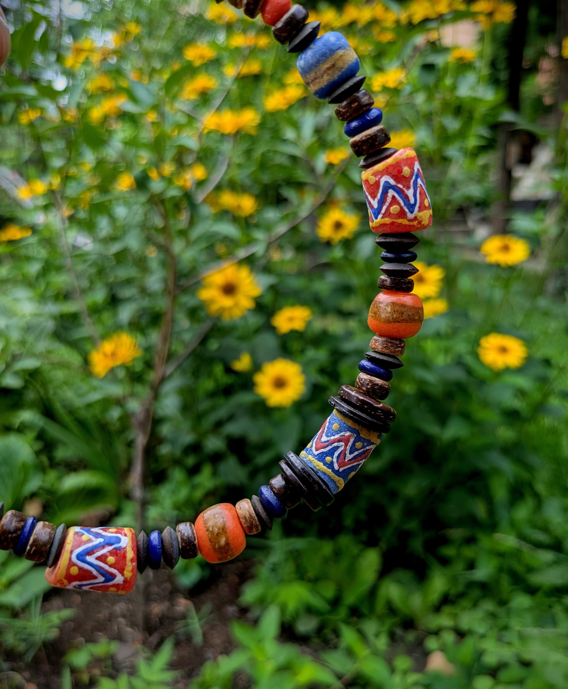 Náhrdelník je vytvořen z originálních afrických "krobo" korálků z recyklovaného skla, které se tradičně vyrábí v Ghaně, ty jsou doplněny korálky ze dřeva a z kokosu. Navlečeno na obruči, která je určena pro obvod krku 33-38 cm - lze regulovat karabinou a řetízkem. Řetízek a karabinka je z bižuterního kovu.