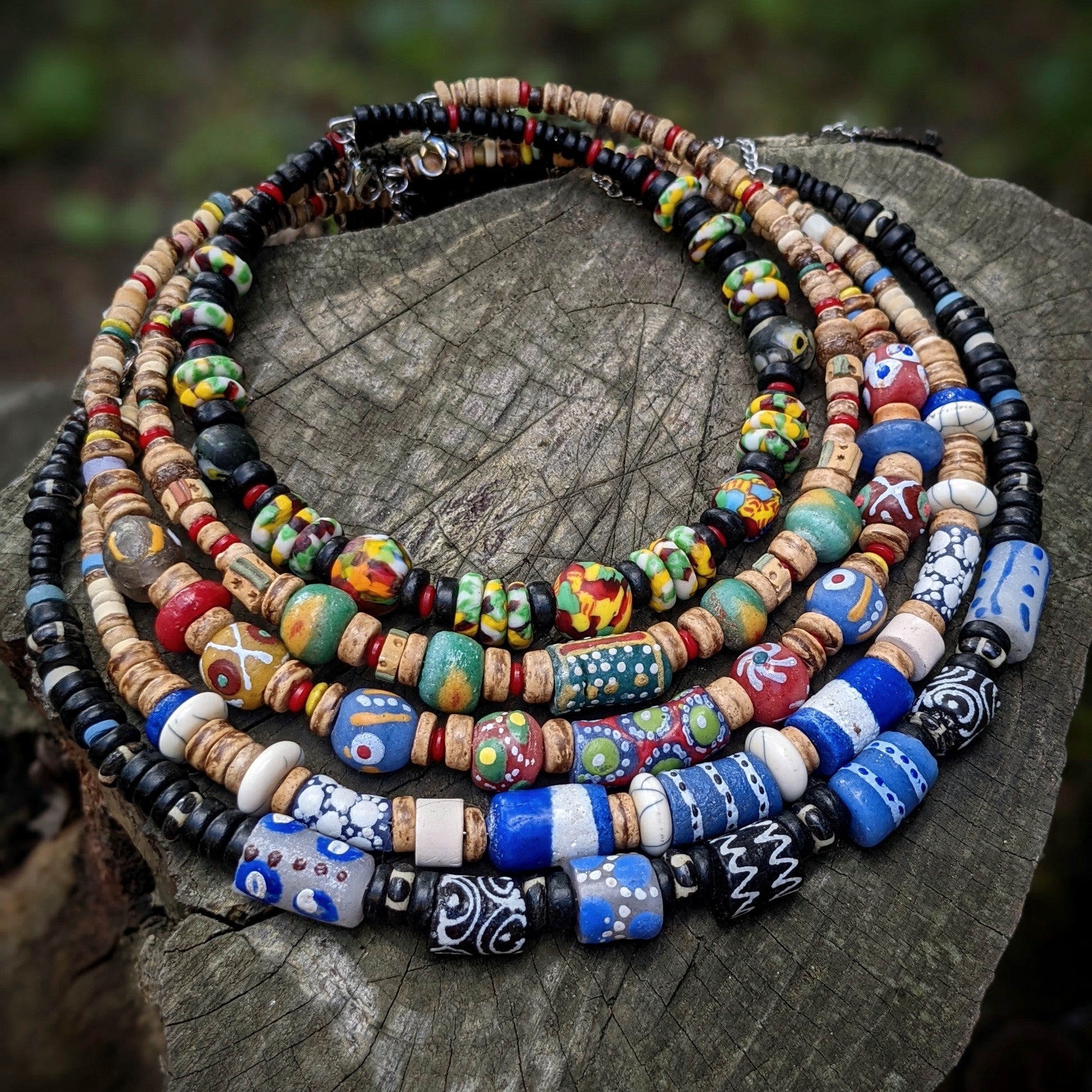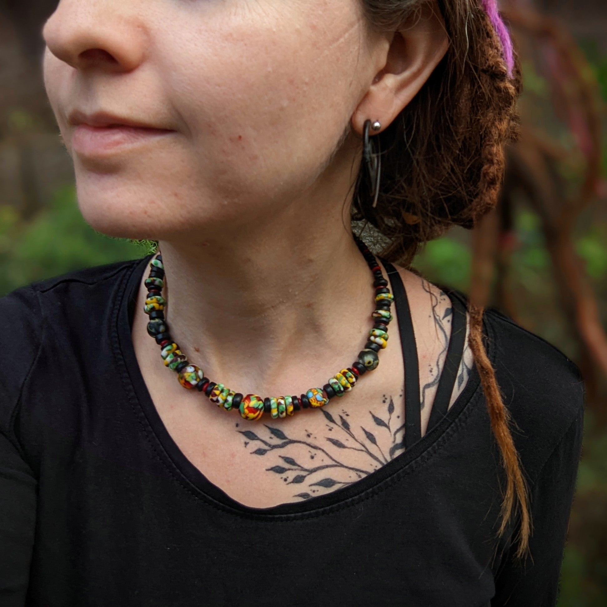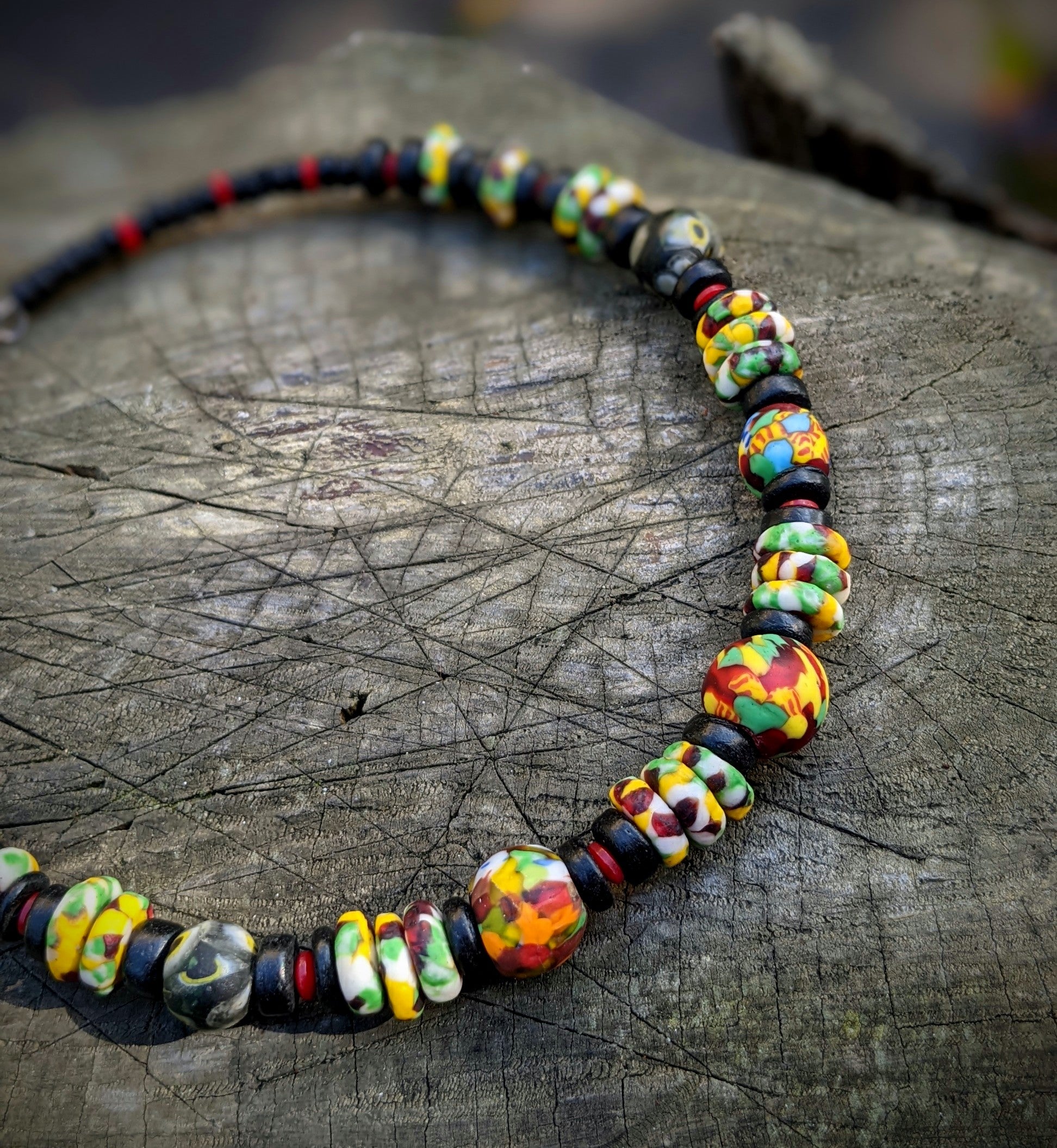 Náhrdelník je vytvořen z originálních afrických "krobo" korálků z recyklovaného skla, které se tradičně vyrábí v Ghaně. Ty jsou doplněny kokosovými a keramickými korálkami. Navlečeno na obruči, která je určena pro obvod krku 33-38 cm - lze regulovat karabinou a řetízkem. Řetízek a karabinka je z bižuterního kovu.