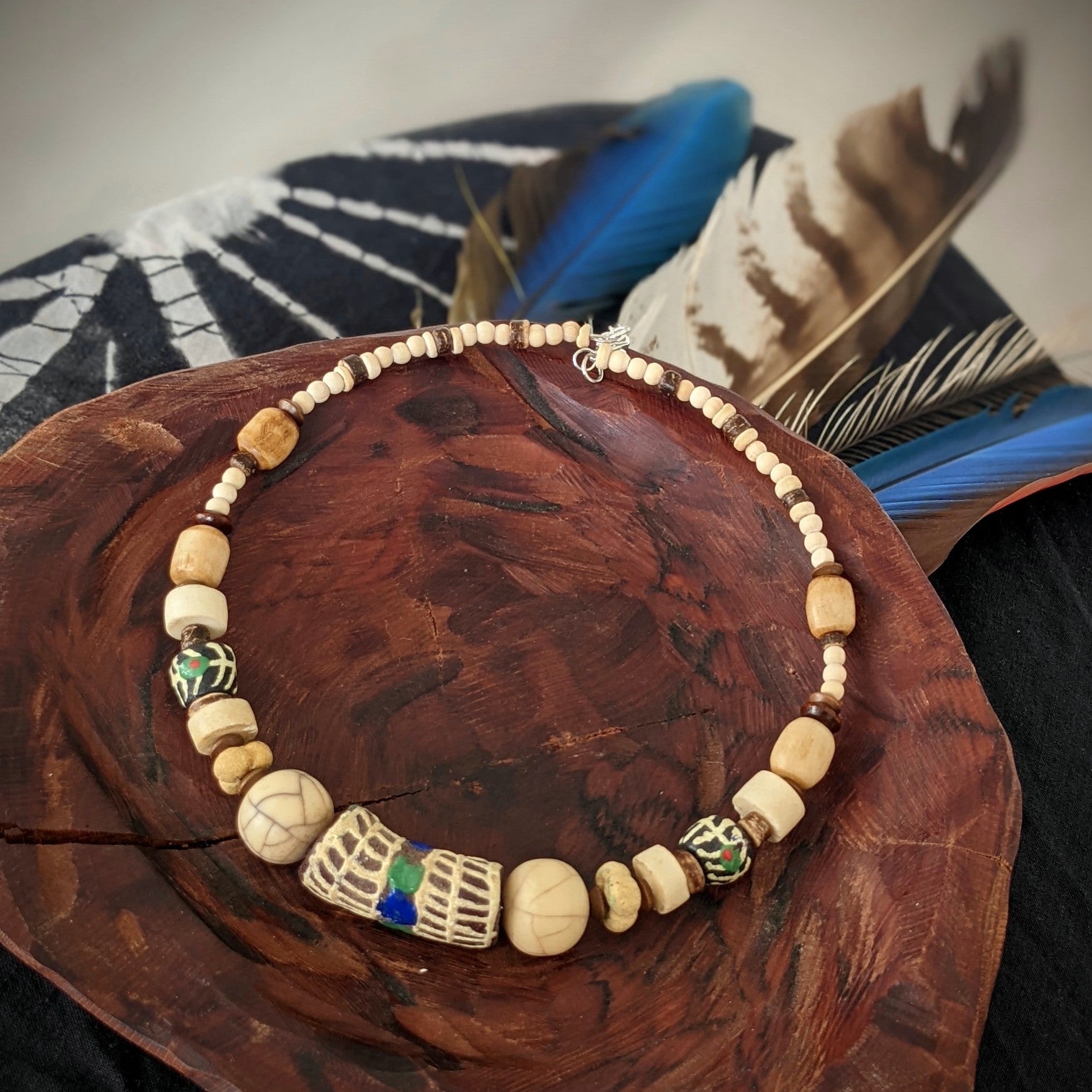 Náhrdelník je vytvořen z originálních afrických "krobo" korálků z recyklovaného skla, které se tradičně vyrábí v Ghaně, které jsou doplněny dřevěnými, kostěnými a kokosovými korálkami. Navlečeno na obruči průměru 12 cm, která je určena pro obvod krku 30-35 cm - lze regulovat karabinou a řetízkem. Řetízek a karabinka je z bižuterního kovu.