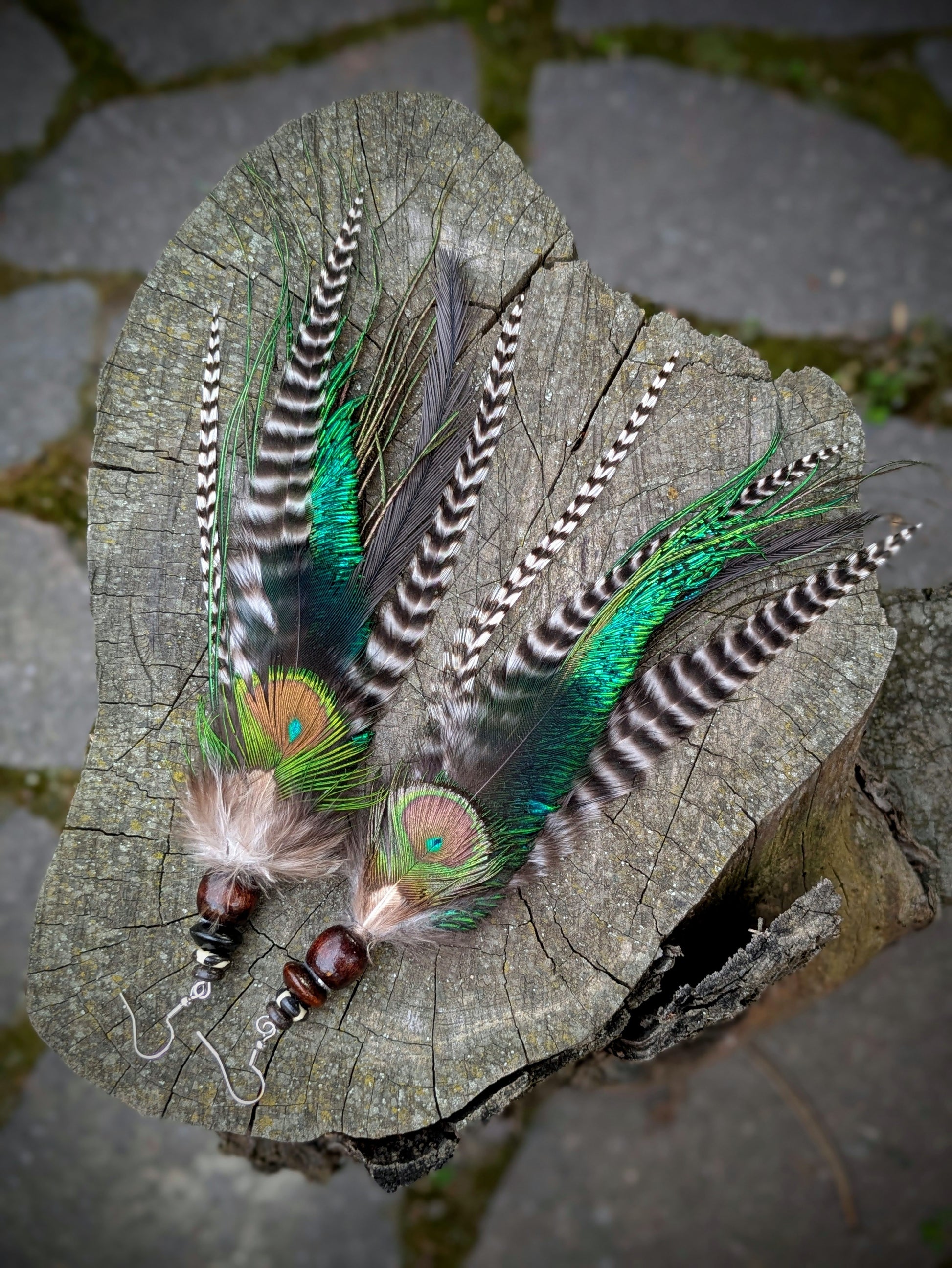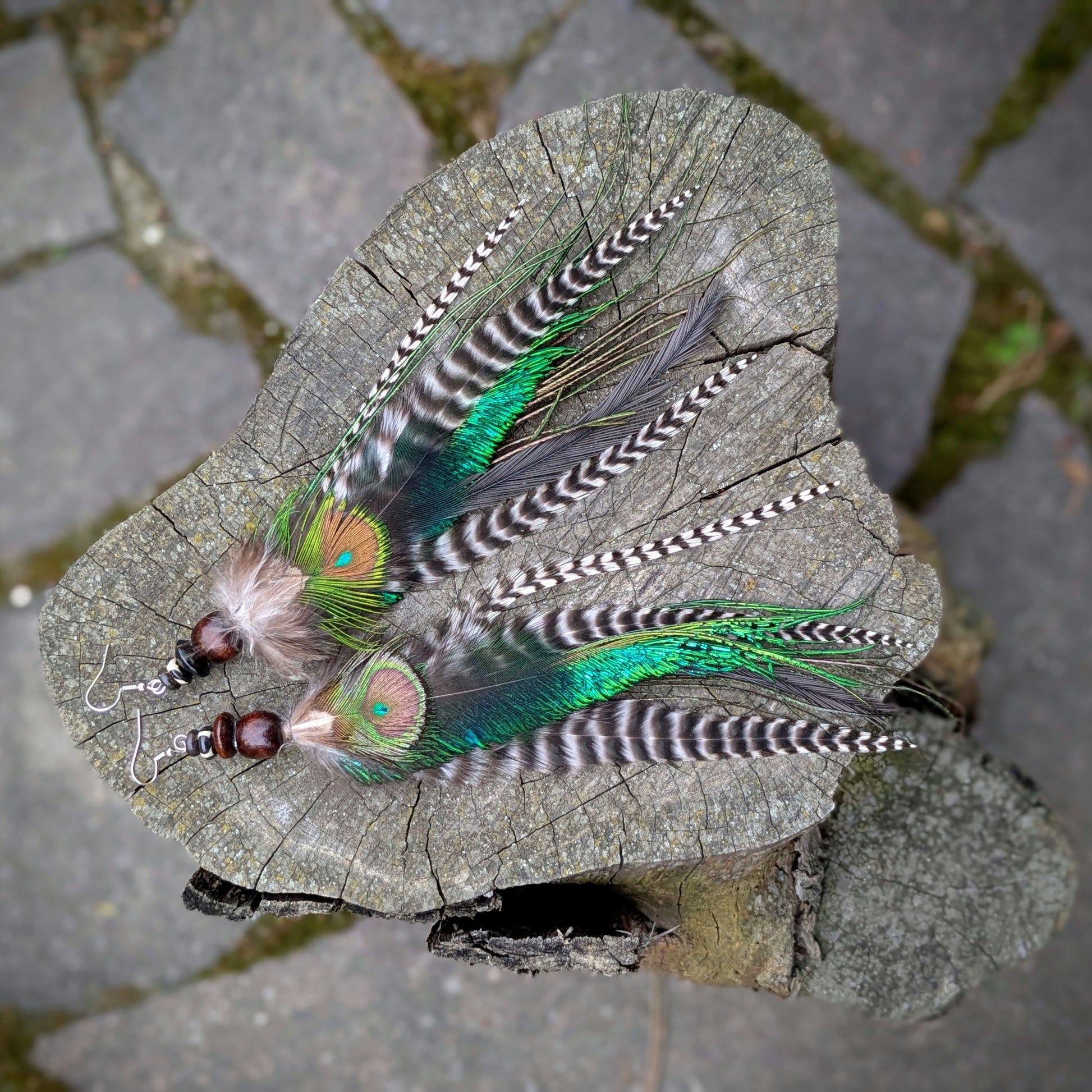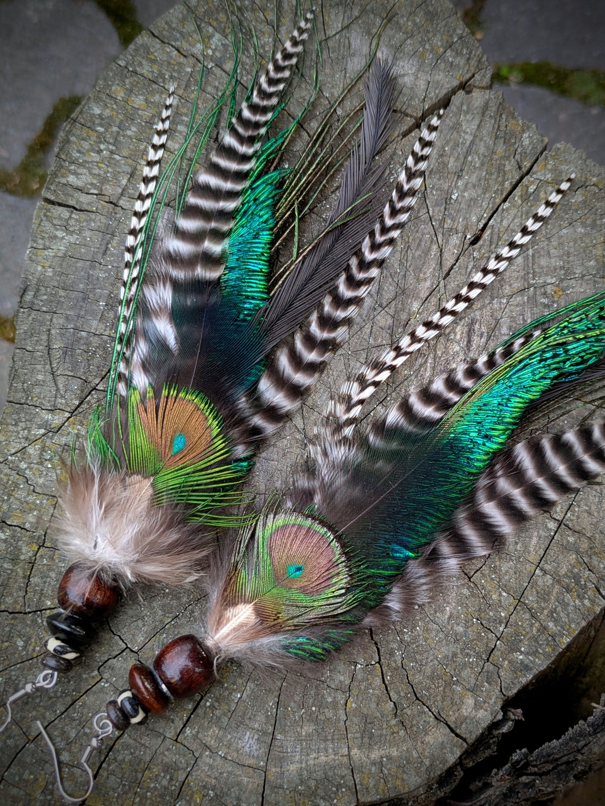 Výrazné peříčkové náušnice (emu, páv, kohout...) doplněné dřevěnými a kostěnými korálky. Háčky jsou z nerezové oceli, dodávám se silikonovými zarážkami. Délka ozdobné části náušnic je cca 20 cm.