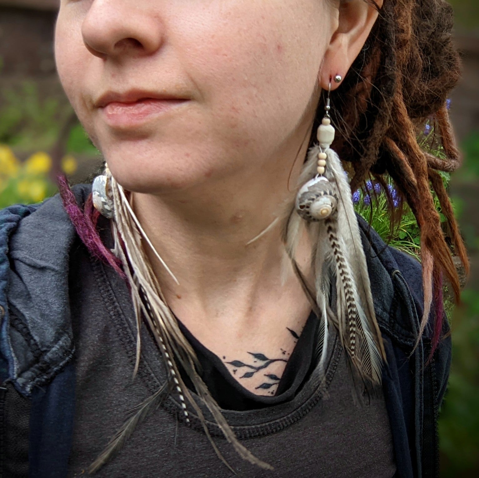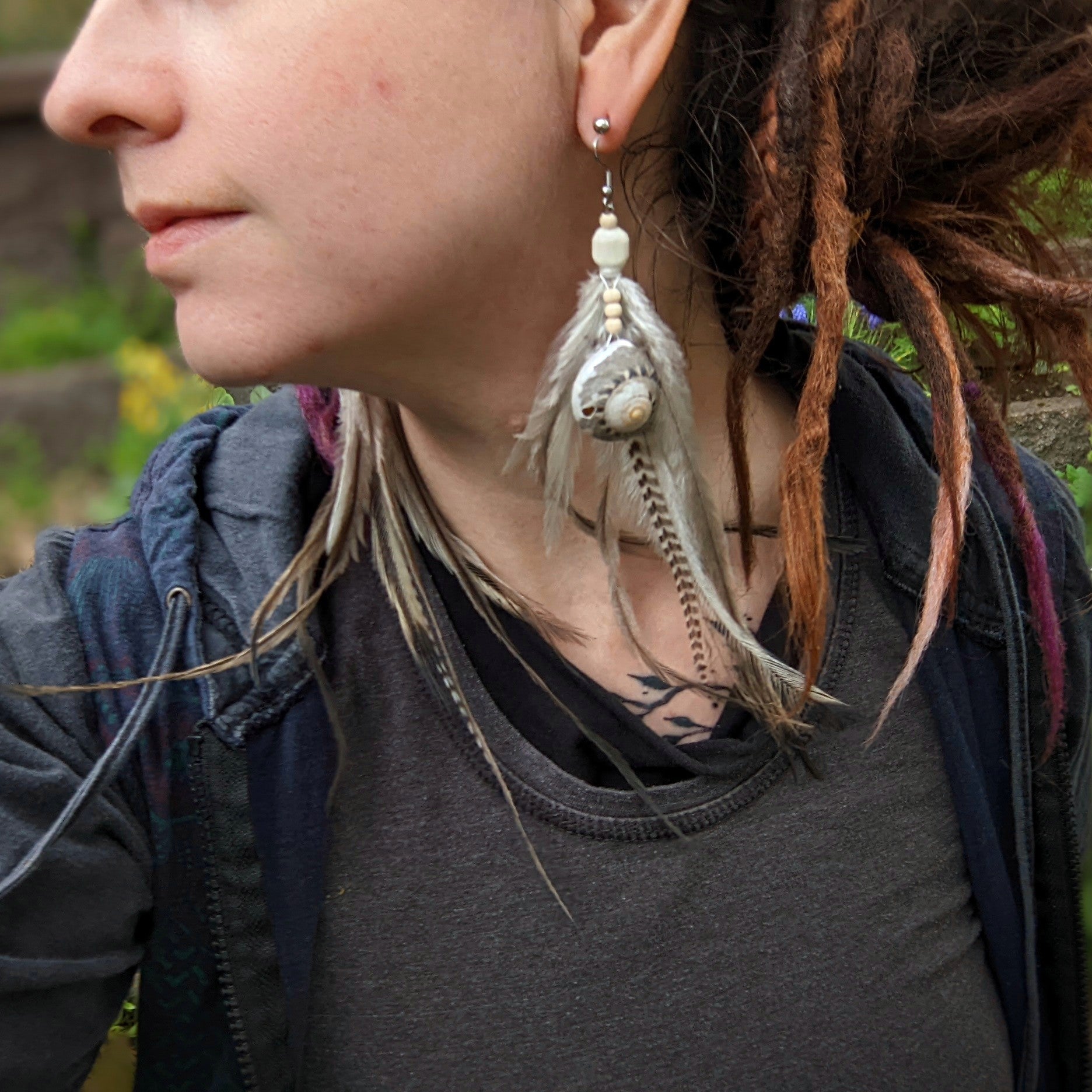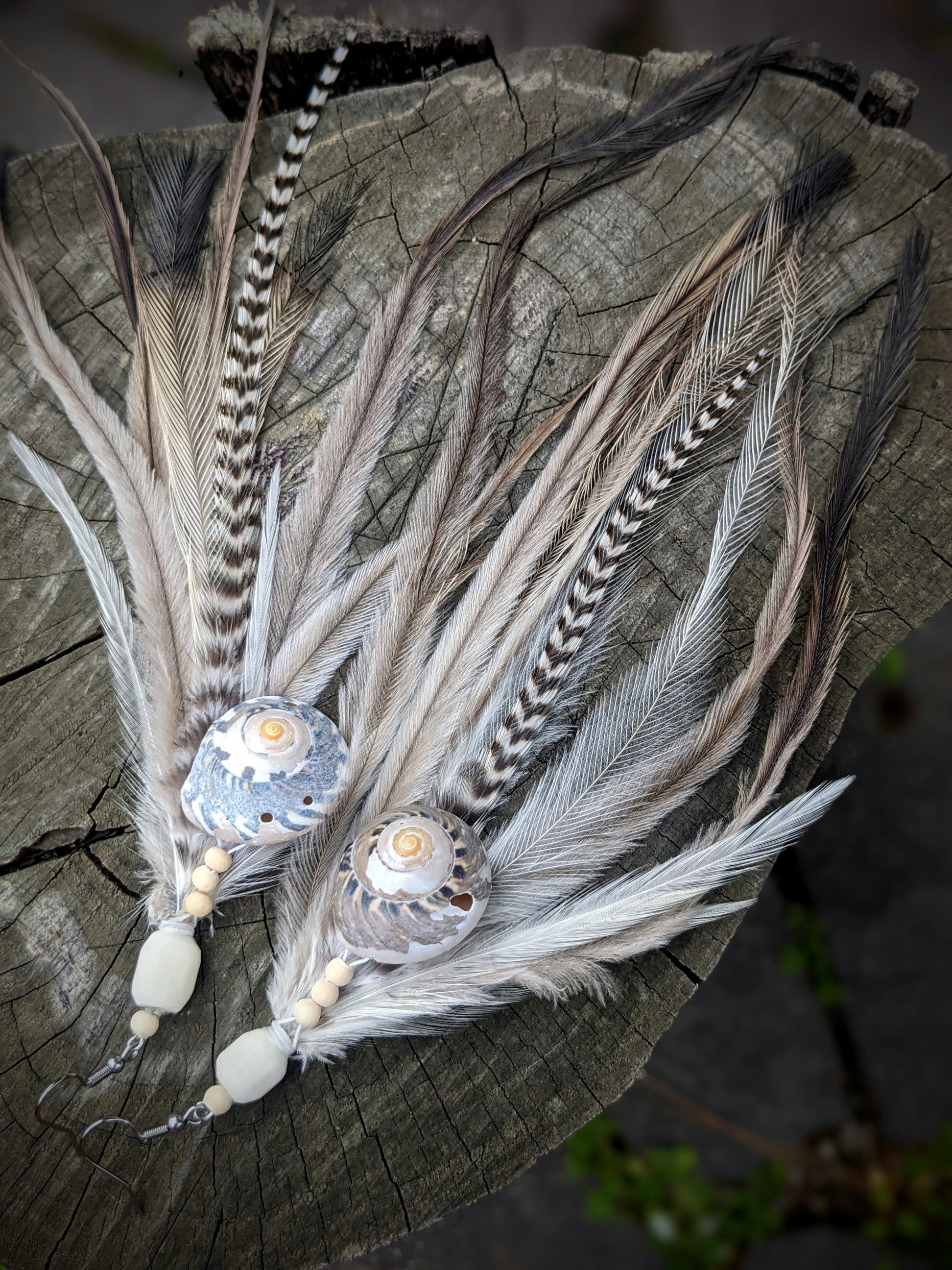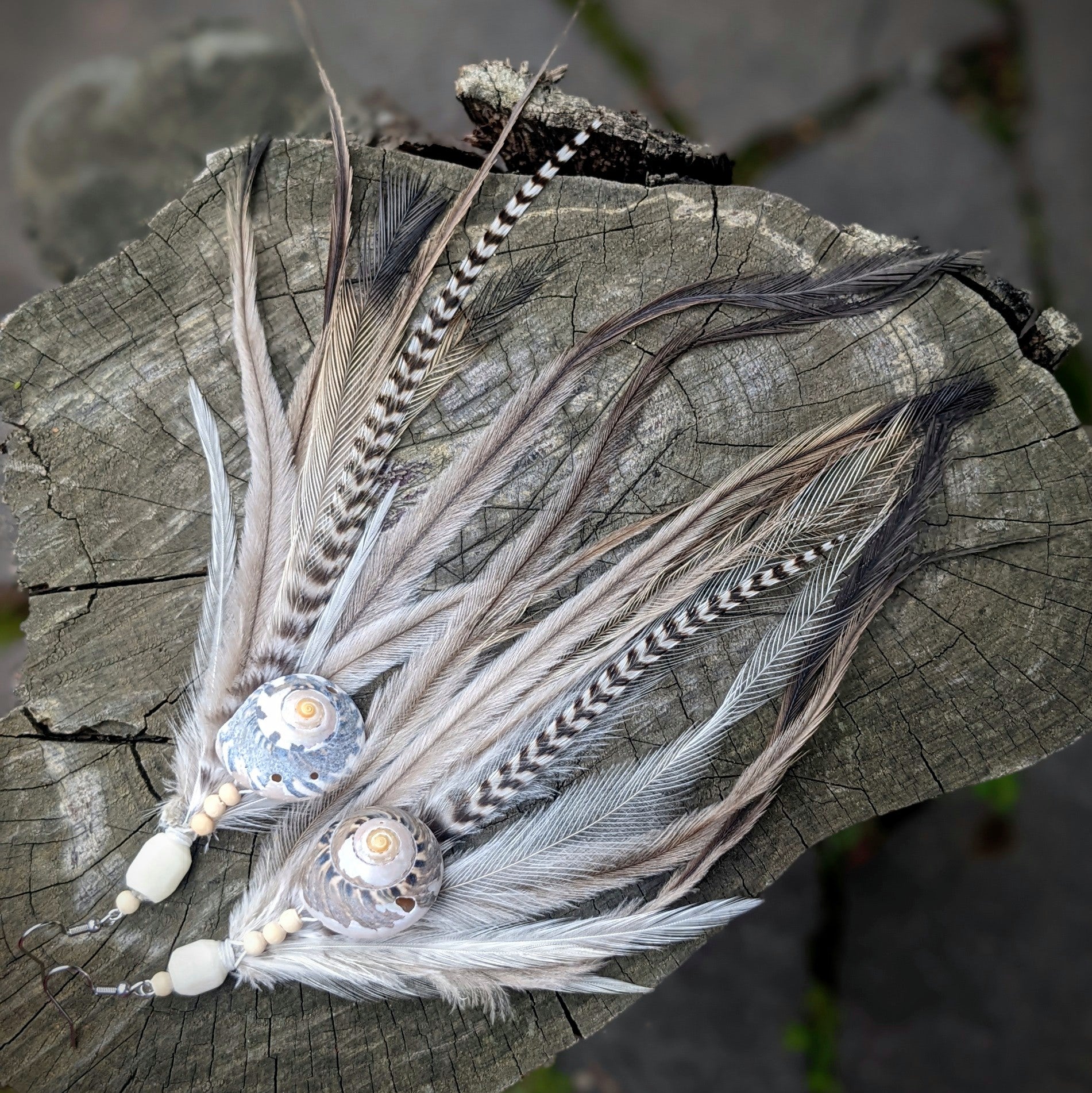 Výrazné peříčkové náušnice (emu, kohout...) doplněné kostěnými a dřevěnými korálkami a mušličkami. Háčky jsou z chirurgické oceli, dodávám se silikonovými zarážkami. Délka ozdobné části náušnic je cca 20 cm.