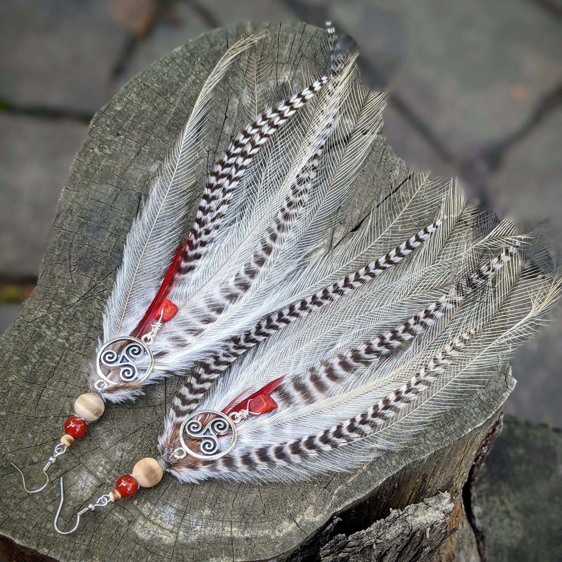 Výrazné peříčkové náušnice (emu, kohout, bažant...) s triskelem doplněné korálkami ze dřeva, karneolu a houbového korálu. Háčky jsou z chirurgické oceli, dodávám se silikonovými zarážkami. Délka ozdobné části náušnic je cca 23 cm.