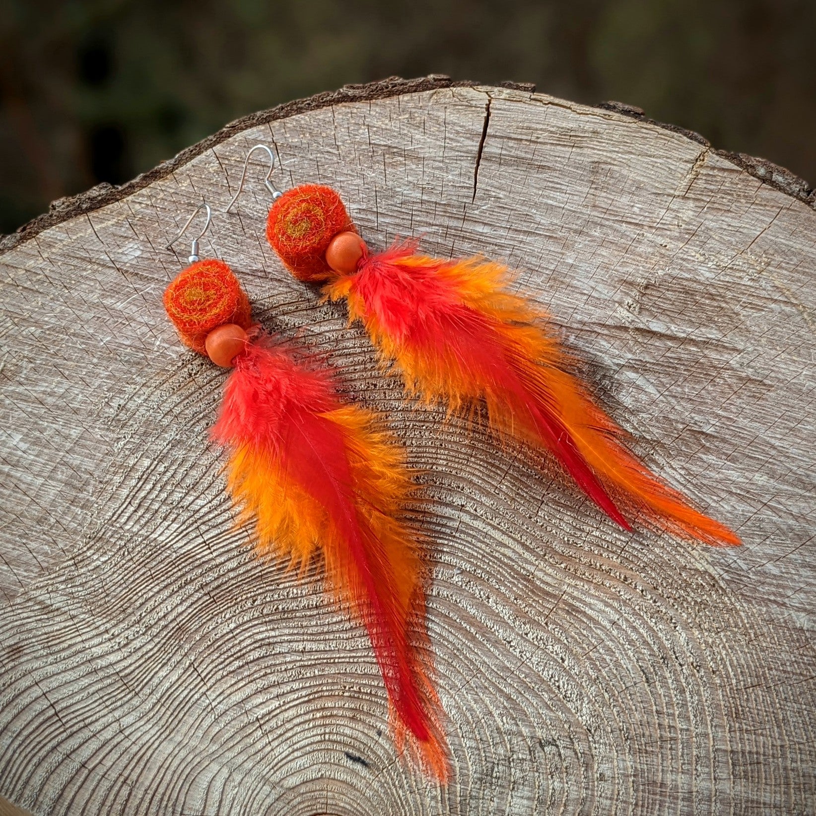 Barevné boho náušnice s barevnými pírky, plstěnou spirálou a dřevěnými korálkami. Háčky jsou z chirurgické oceli, dodávám se silikonovými zarážkami. Délka ozdobné části náušnic je cca 12 cm.