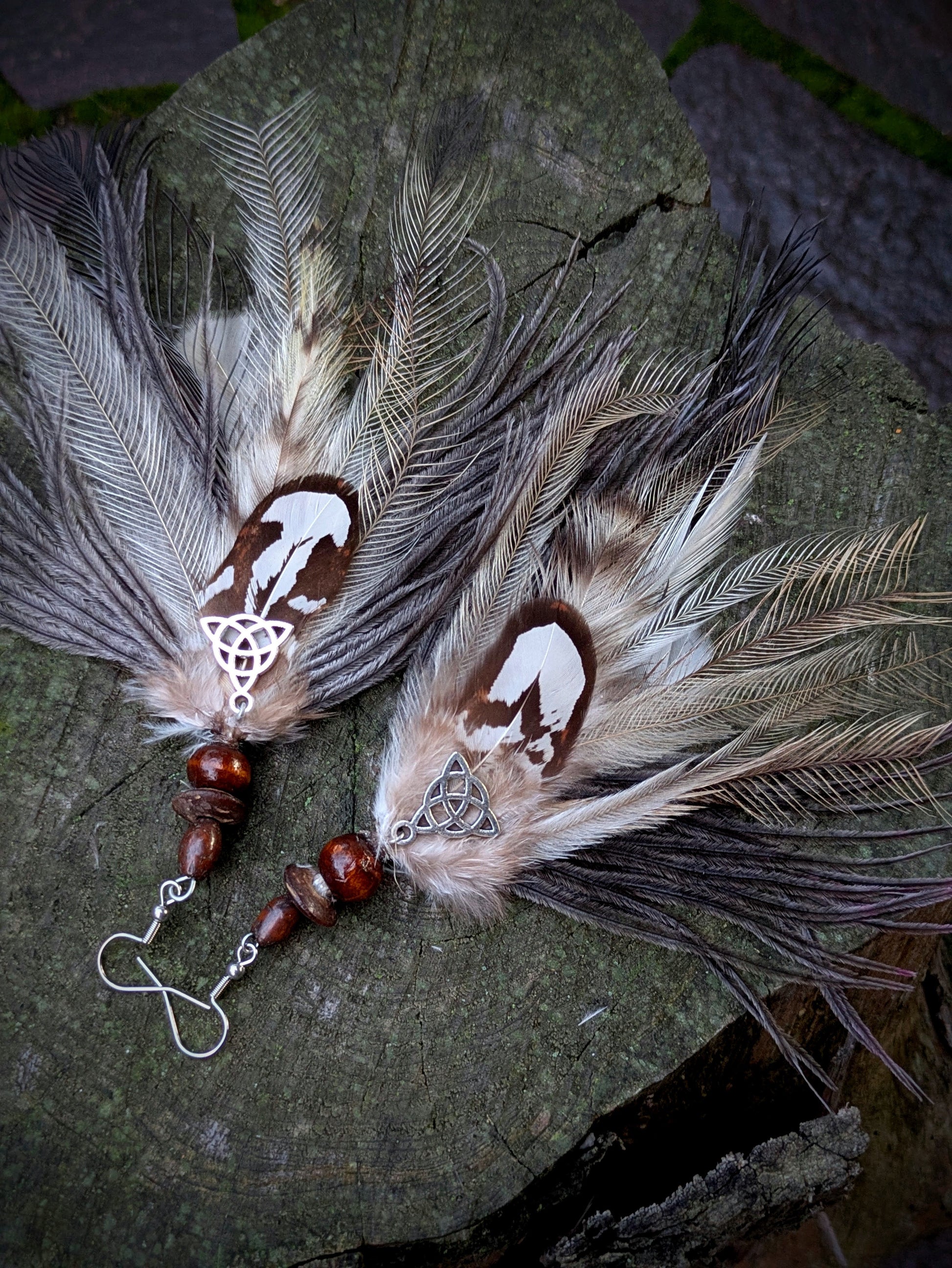 Výrazné peříčkové náušnice (emu, pštros, kohout...) doplněné dřevěnými a kostěnými korálky a kovovými přívěsky. Háčky jsou z nerezové oceli, dodávám se silikonovými zarážkami. Délka ozdobné části náušnic je cca 15 cm.