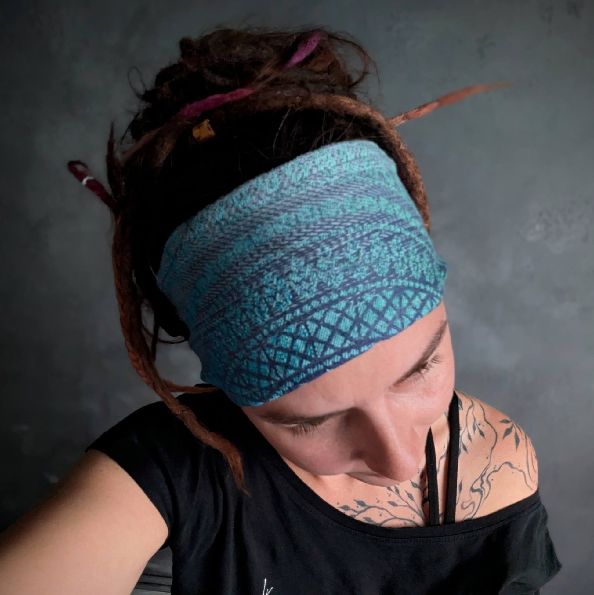 Praktická šátková čelenka šitá z odstřižku šátku na nošení dětí (značka Lenny Lamb).