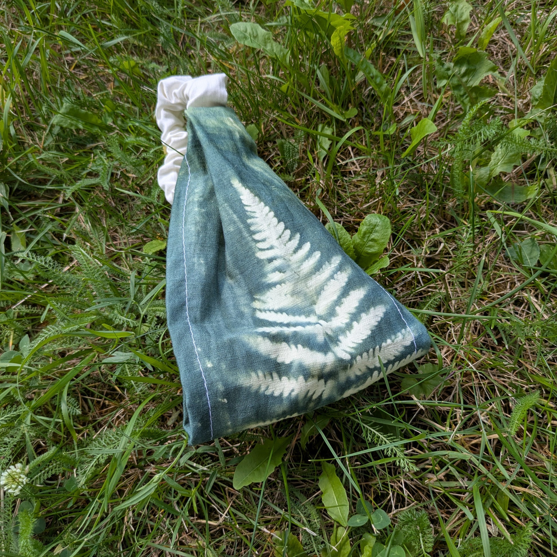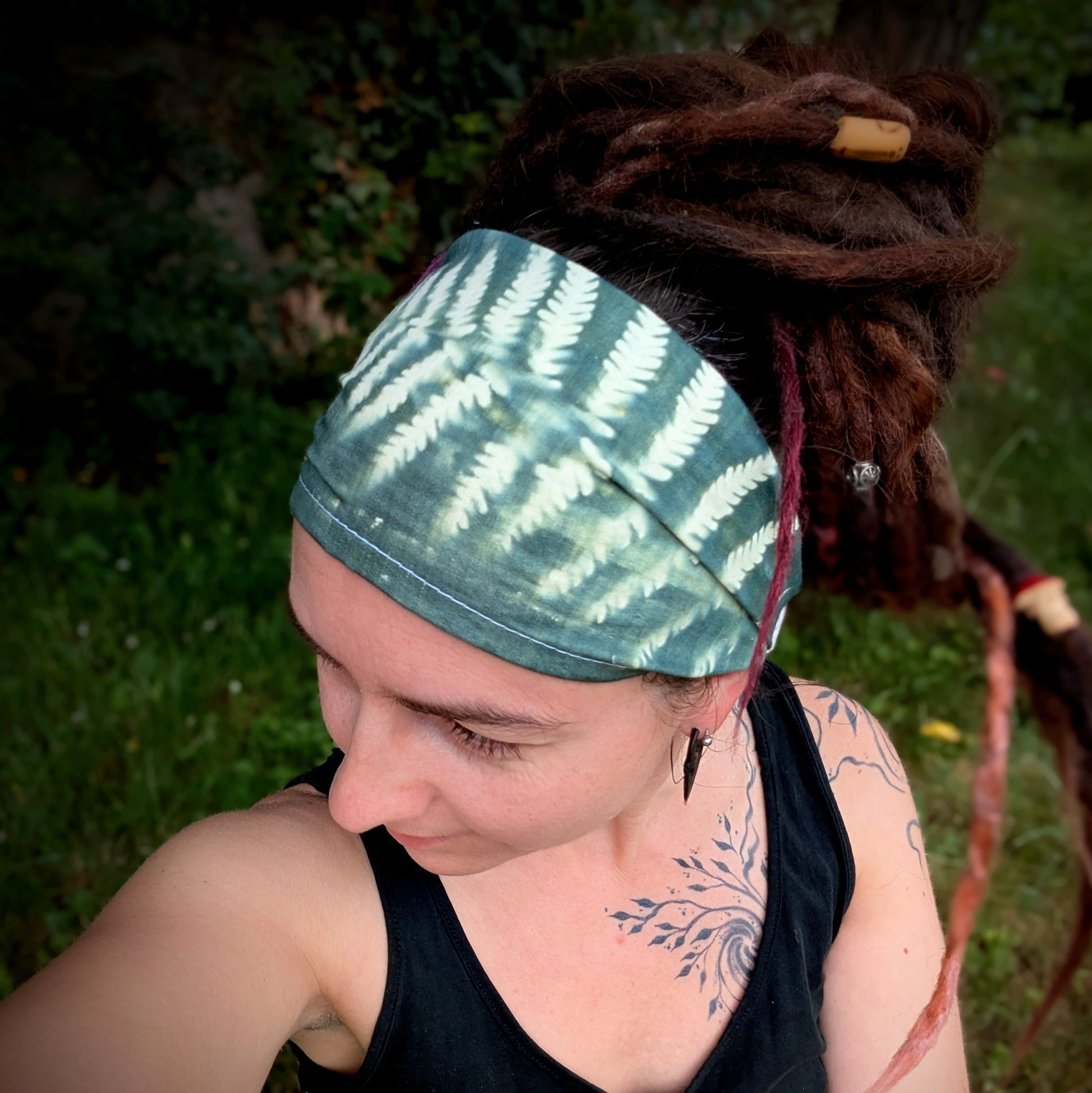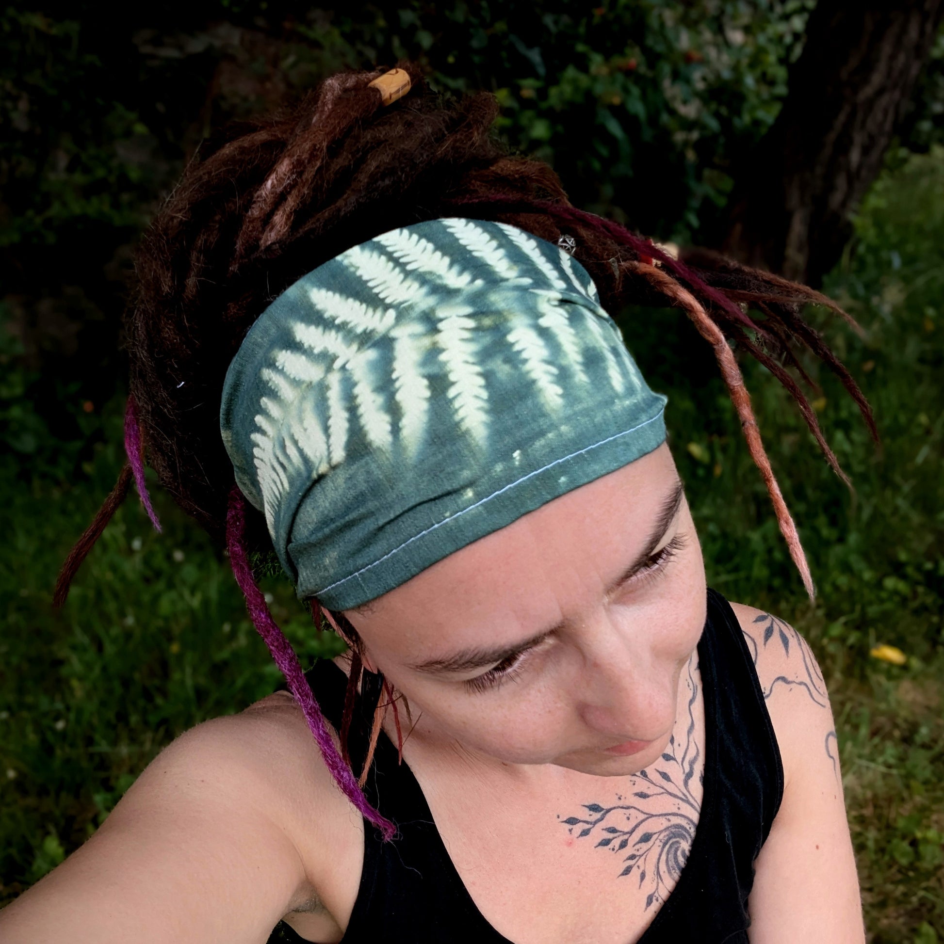 Praktická šátková čelenka šitá z recyklovaného plátna a barvená "slunečními" barvami s obtisky reálných listů.