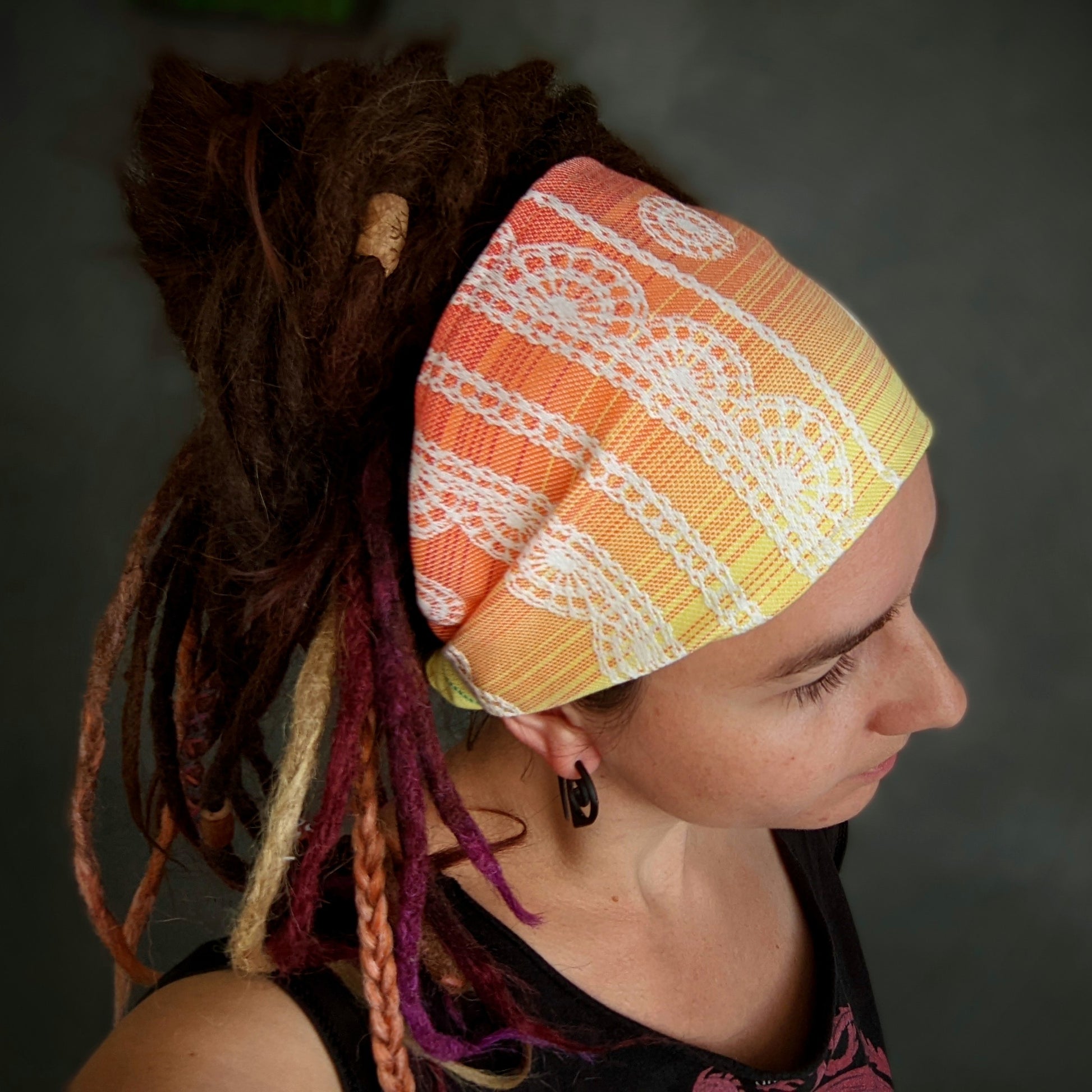 Šátkové čelenky jsou super na sport, na léto, když nechcete, aby vám svítilo na hlavu, ale také chcete-li zkrotit vlasy padající do očí. U copánků jsou ideální na zakrytí odrostů, pokud je máte zapletené už delší dobu a skvěle poslouží i na dready a fakedready. Velikost se snažím šít co nejvíce univerzální.