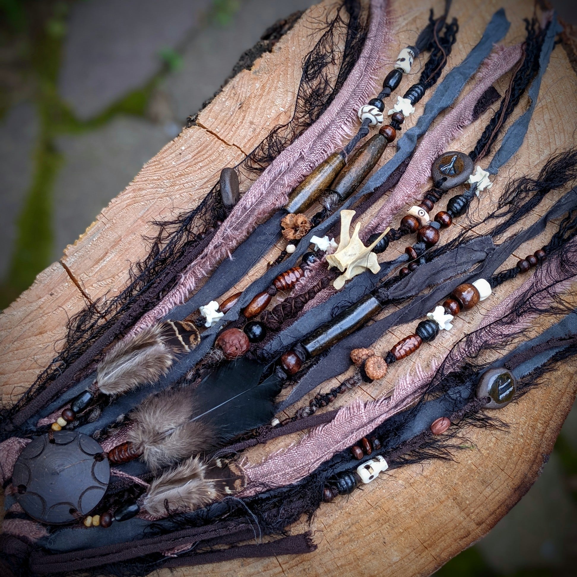 Spona do vlasů a dreadů, která se skládá z dřevěného kroužku a jehlice ze santalového dřeva (krásně voní). Spona je zdobena odstřižky látek a přízí, dřevěnými a kostěnými korálkami, žaludy, kůstkami a pírky.