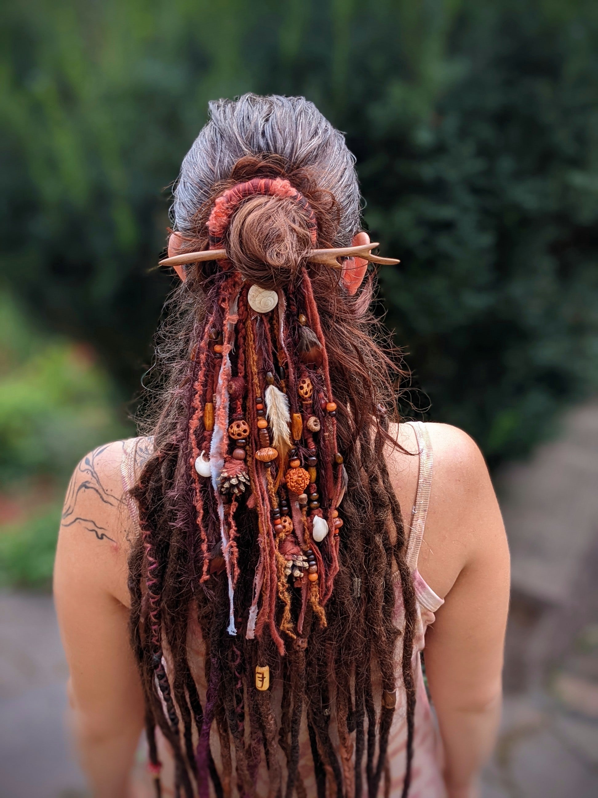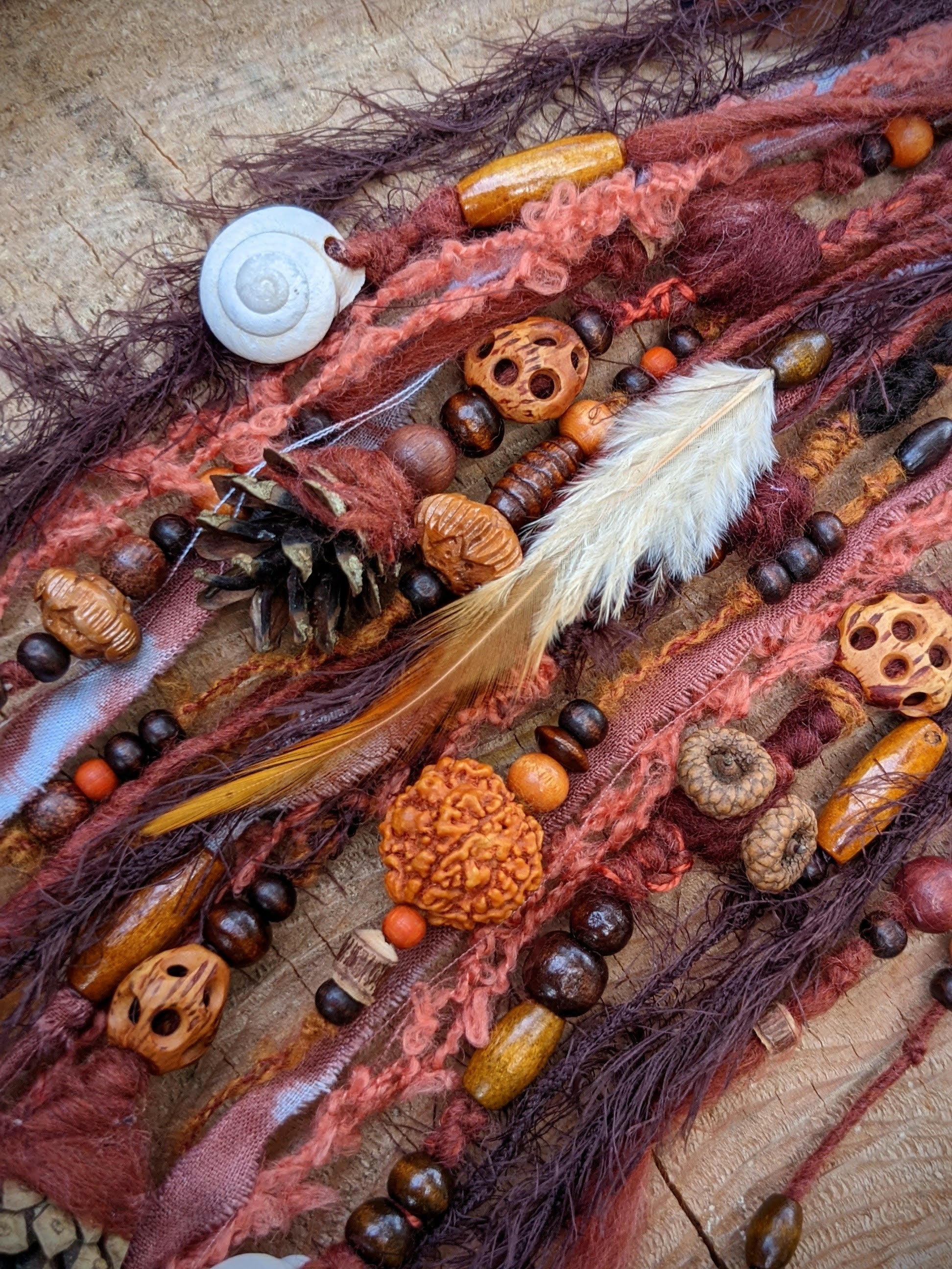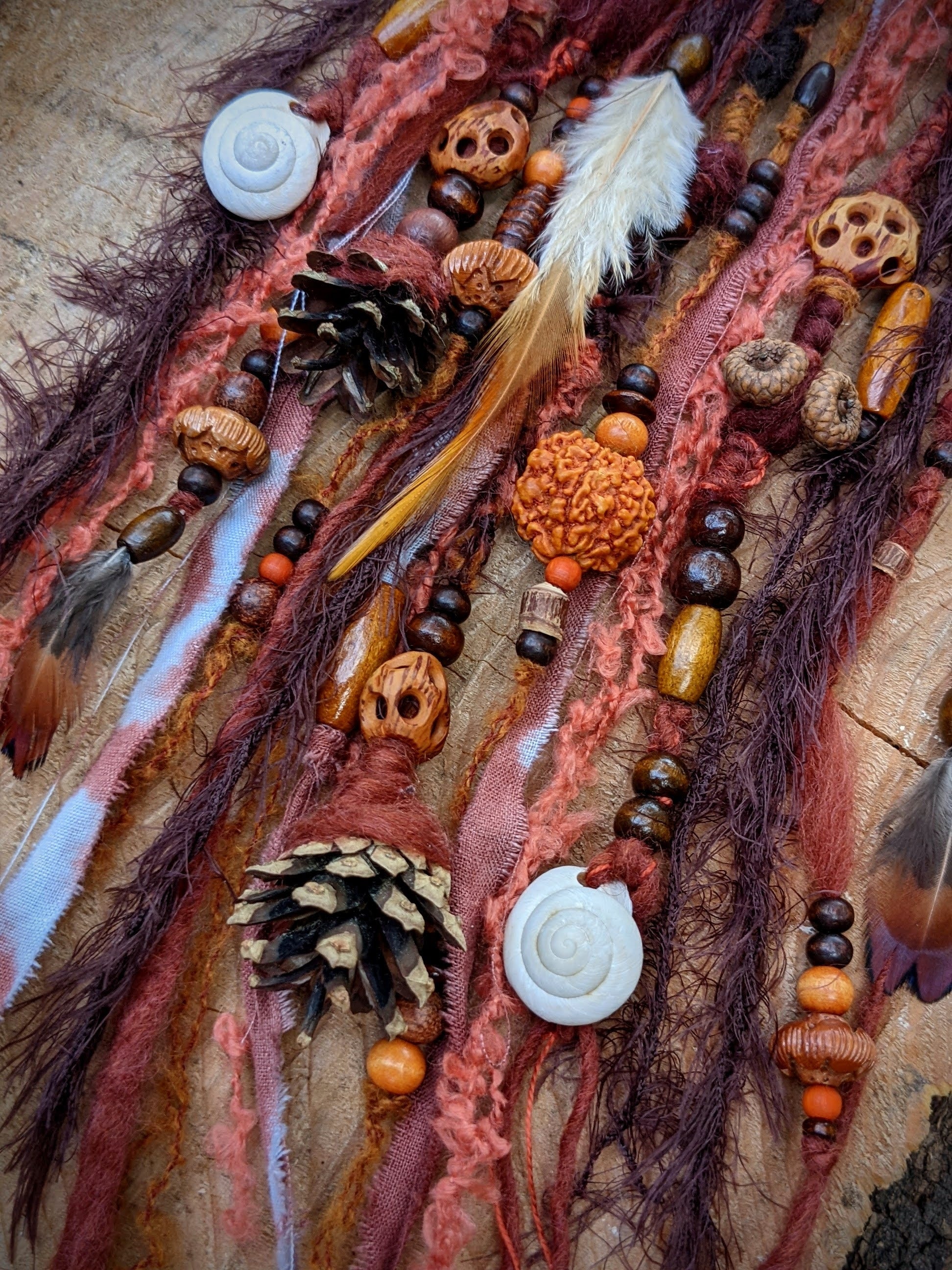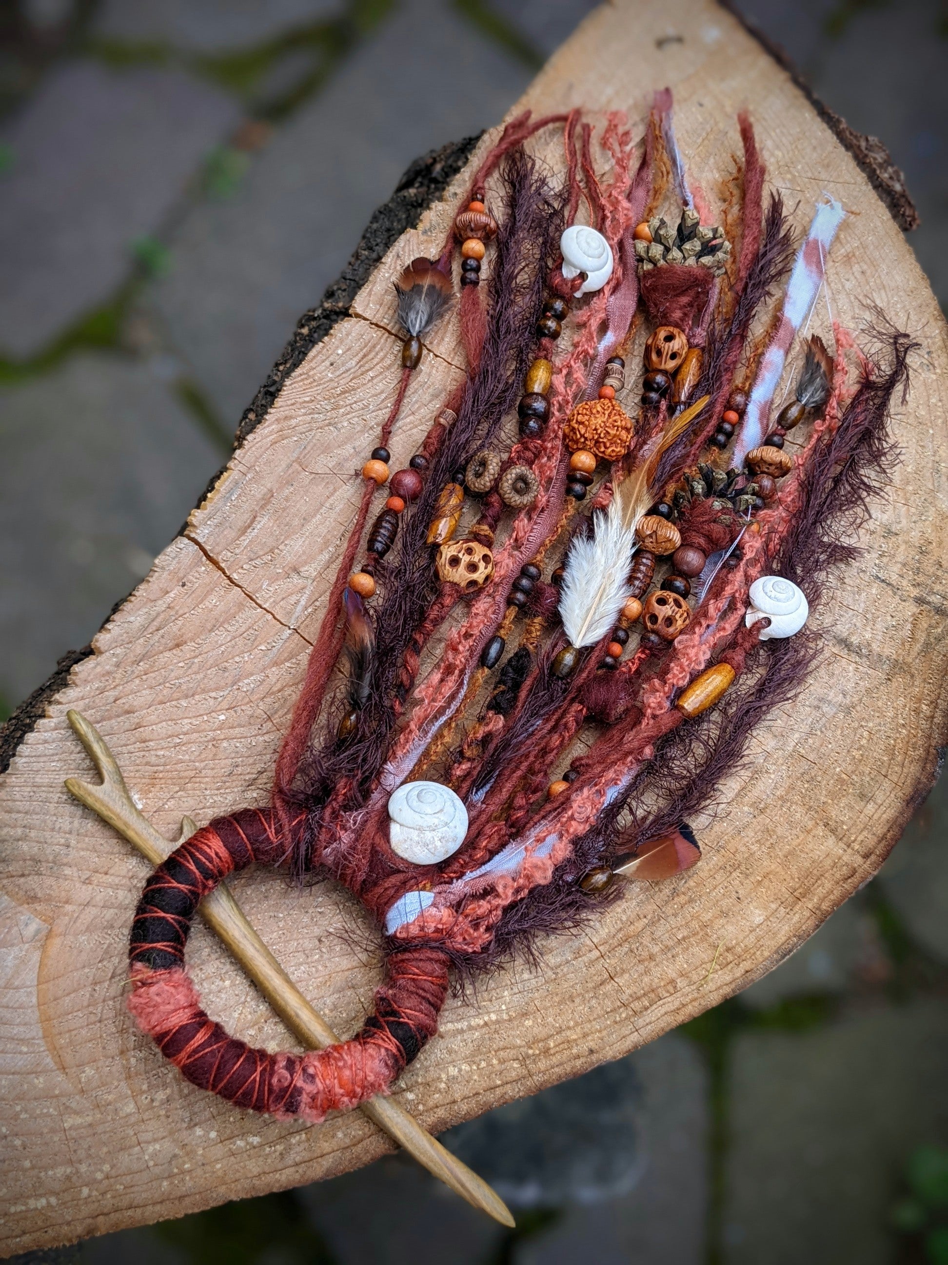 Spona do vlasů a dreadů, která se skládá z dřevěného kroužku a jehlice ze santalového dřeva (krásně voní). Spona je zdobena odstřižky látek a přízí, dřevěnými korálkami, šiškami, žaludy, ulitami a pírky.