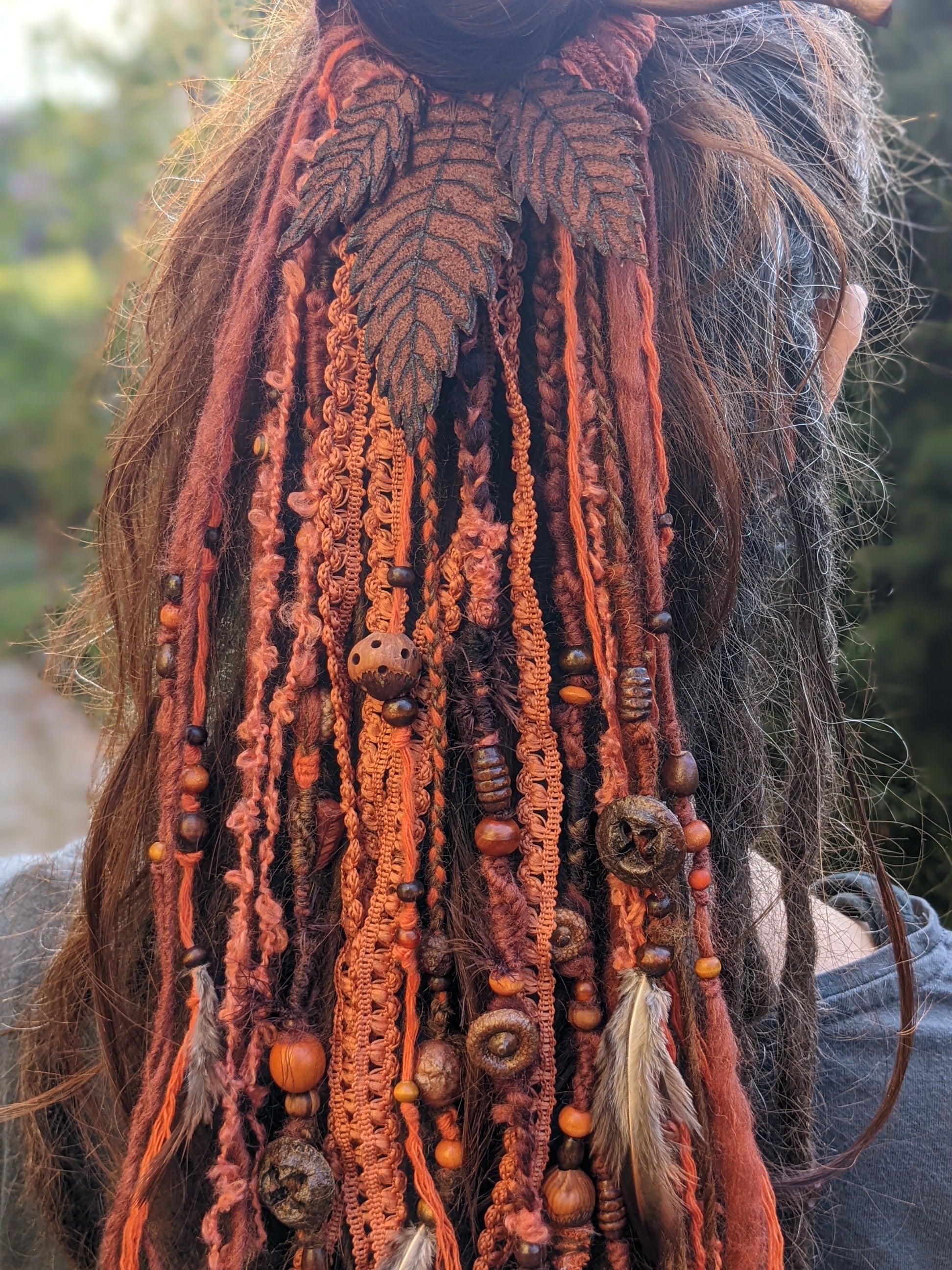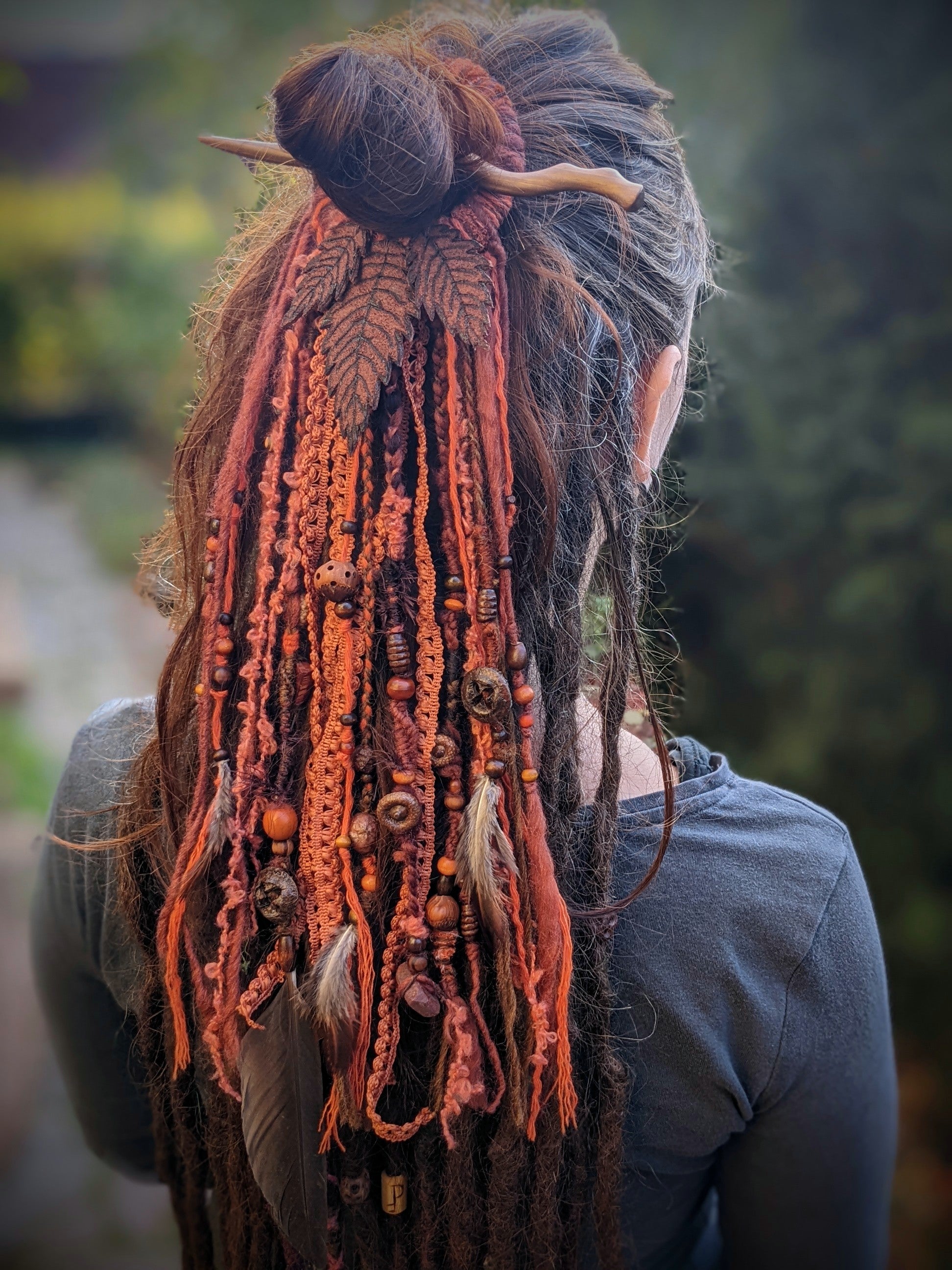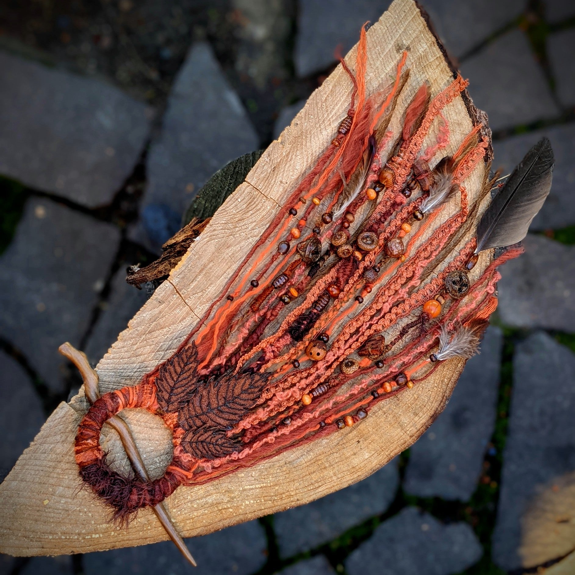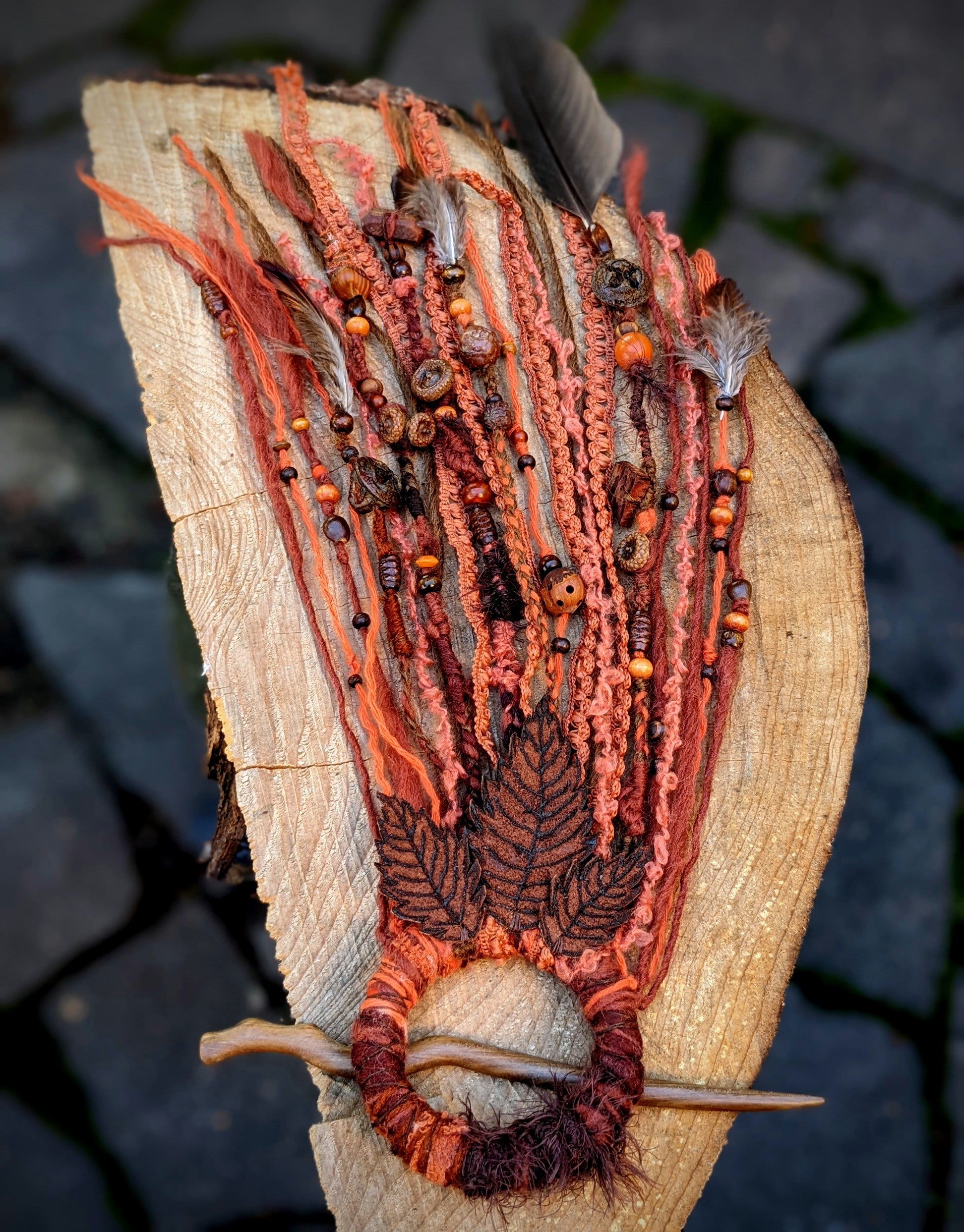 Spona do vlasů a dreadů, která se skládá z dřevěného kroužku a jehlice ze santalového dřeva (krásně voní). Spona je zdobena krajkou a přízí, dřevěnými a kostěnými korálkami, žaludy, koženými lístěčky, plody eukalyptu, duběnkami a pírky.