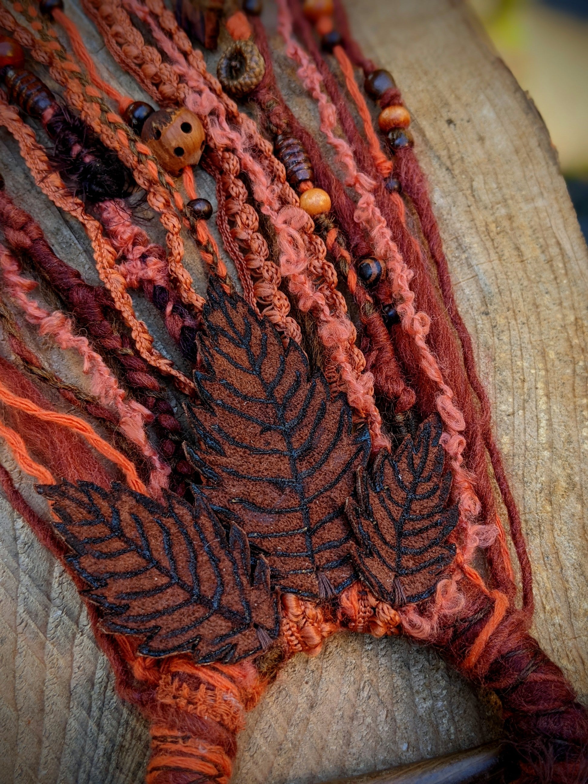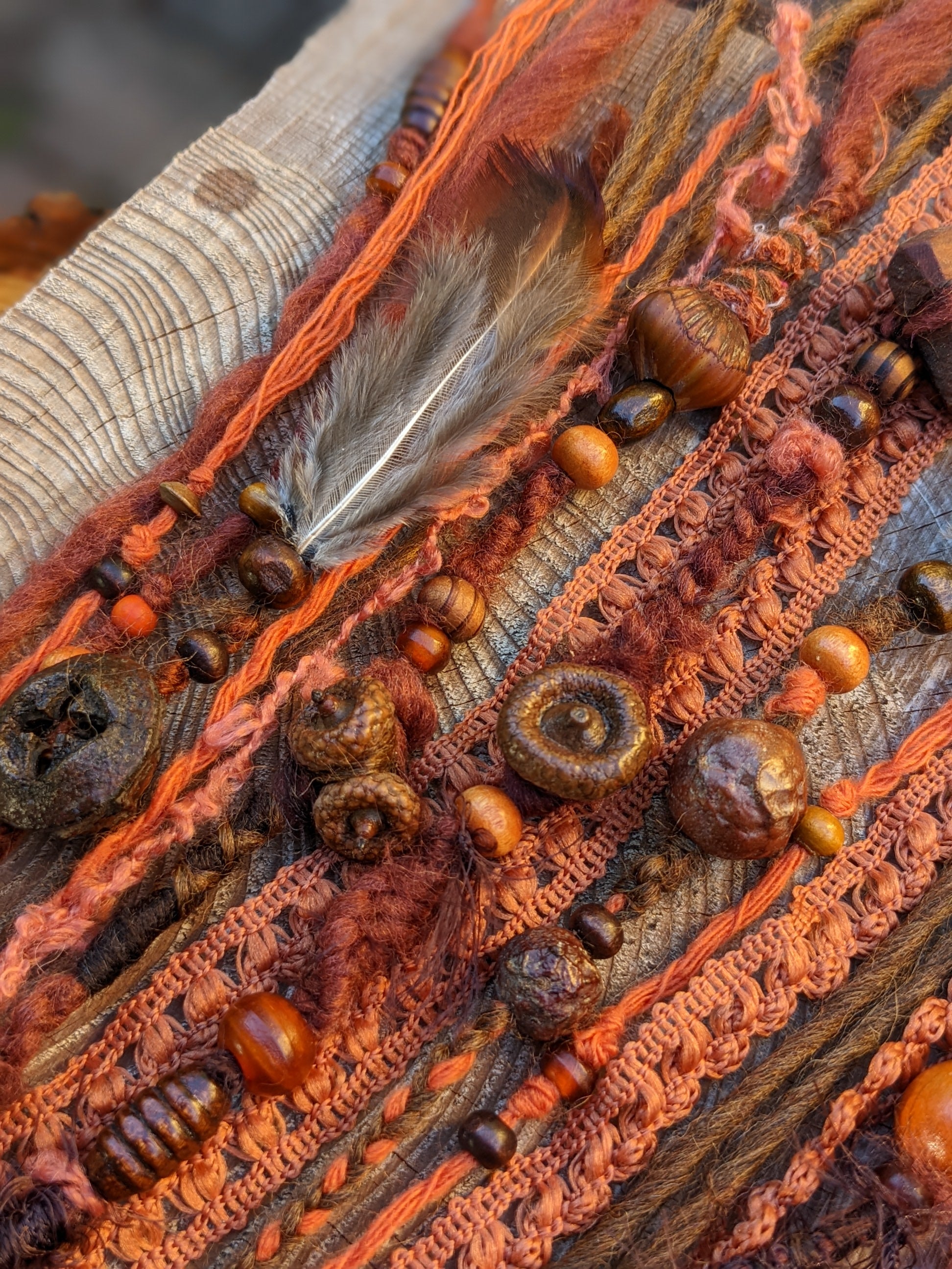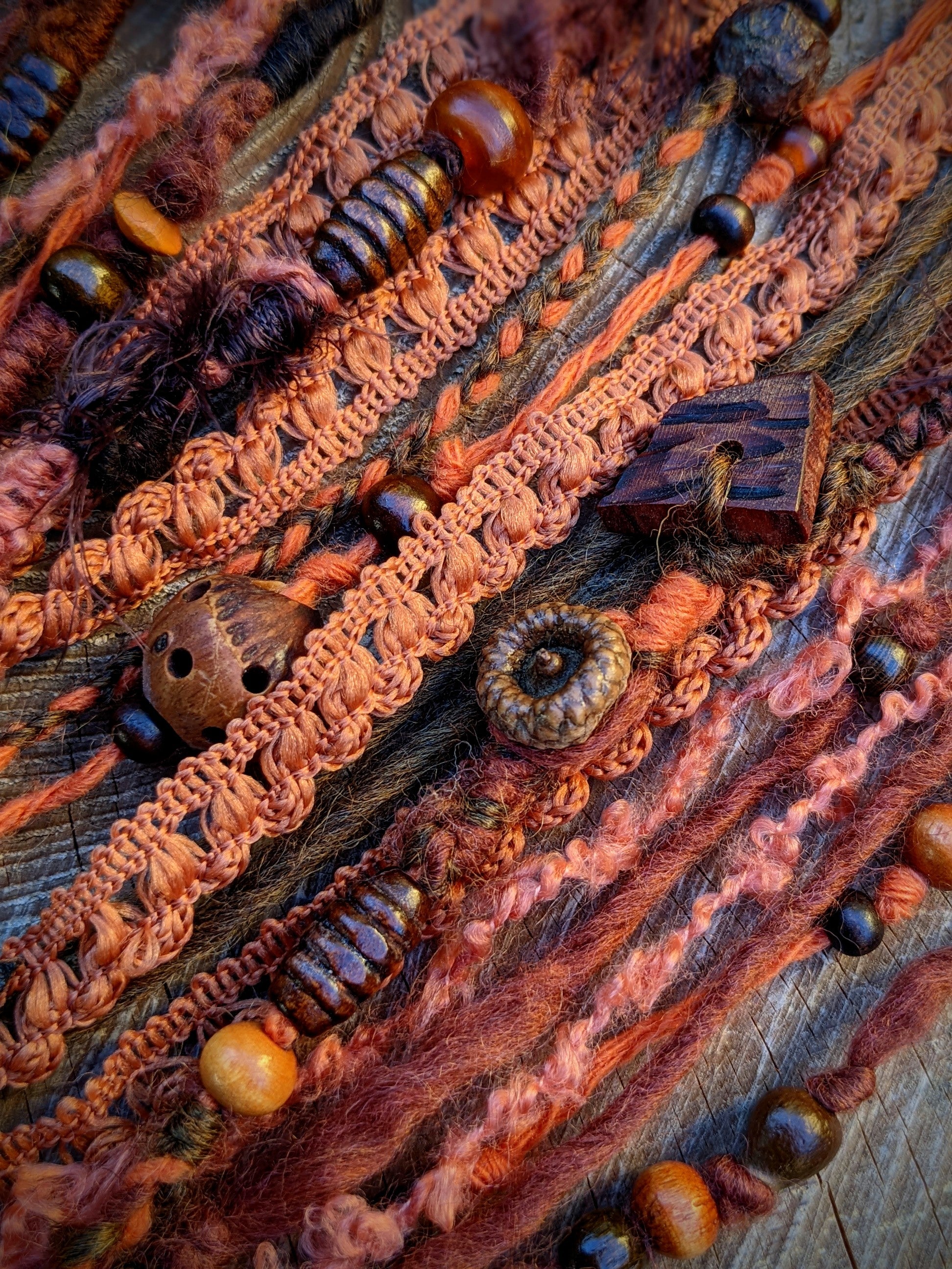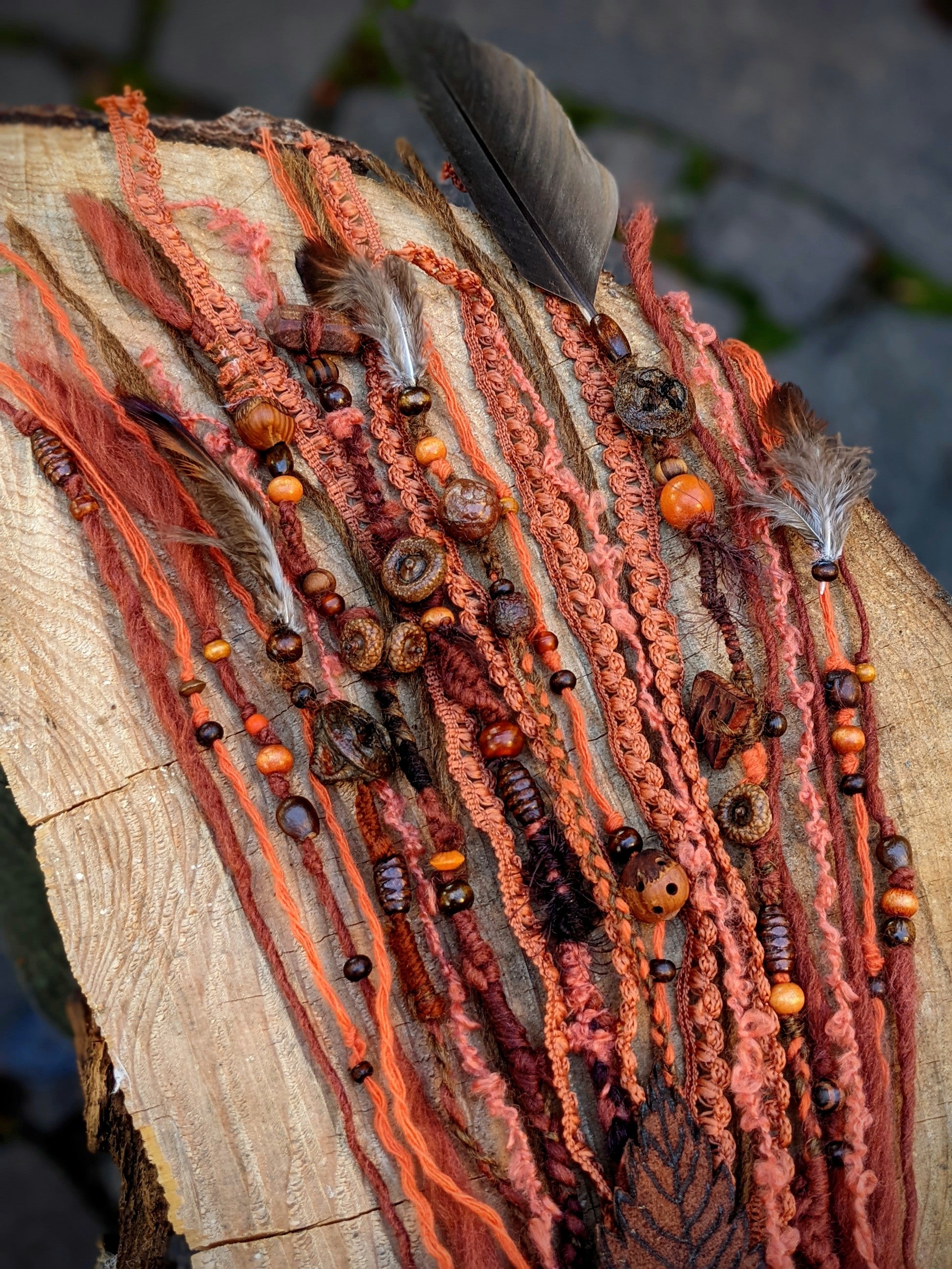 Spona do vlasů a dreadů, která se skládá z dřevěného kroužku a jehlice ze santalového dřeva (krásně voní). Spona je zdobena krajkou a přízí, dřevěnými a kostěnými korálkami, žaludy, koženými lístěčky, plody eukalyptu, duběnkami a pírky.